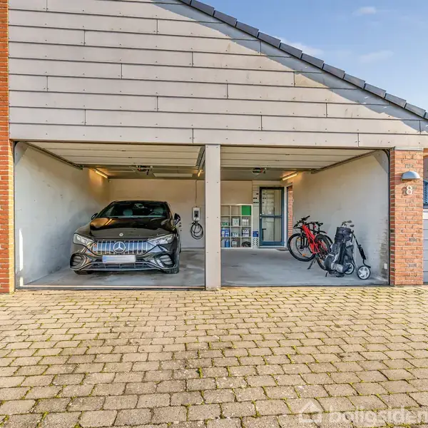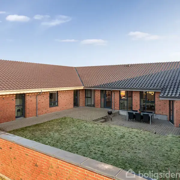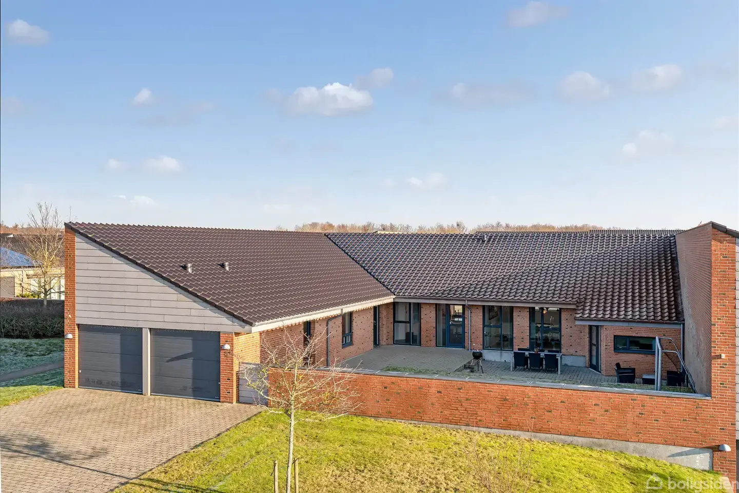 Drømmer du om en moderne, rummelig og indflytningsklar villa i naturskønne og særdeles eftertragtede omgivelser? Denne arkitekttegnede 1-plans gårdhavevilla fra 2009 fremstår stilfuld, yderst velholdt og opført i tidløse kvalitetsmaterialer. Boligen rummer hele 186 m² gennemtænkt boligareal samt integreret og opvarmet dobbeltgarage på 39 m². Huset er dobbeltmuret med vandskurede vægge, eksklusive italienske klinker og trægulve, lydisolerede akustik lofter og gulve samt gennemgående gulvvarme, hv