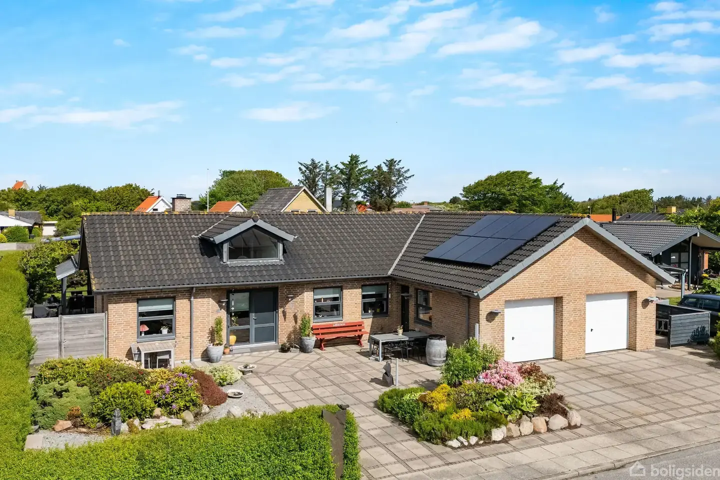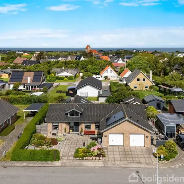 Lønstrup er en hyggelig og driftig by med knap 600 indbyggere. Der er busforbindelser til Hjørring, hvorfra der går tog til Hirtshals, Frederikshavn, Brønderslev og videre sydpå. Der er skole i Skallerup, som ligger på bussens rute, og i Hjørring er der flere uddannelsesmuligheder, bl.a. Tech College med håndværkeruddannelser, sygeplejeskole og UCN med lærer- og pædagogseminarium, teknisk og alment gymnasium og handelsgymnasium. I Lønstrup er der stort supermarked, kulturhuset Lønstrup Cafe Bio med foredrag, koncerter og filmforevisning. Mange gode butikker med kunsthåndværk, tøj, smykker, brugskunst, gallerier og meget andet. Om sommeren er der mange mennesker i byen, men kvarteret her er et lukket område med helårsbeboelse, så der er stadig stille og roligt. Grunden er mod vejen udlagt med fliseindkørsel og flotte nemme bede som skaber både rum og hygge. På den anden side af huset er haven udlagt med nem græsplæne hvor robotten klarer græsklipning. Så man hver dag kan nyde den flotte grønne plæne. Derudover stakit og hæk til alle sider. Huset ligger på en blind vej, så der er ikke trafik til andre end de otte huse på vejen. Super flot og gennemgående kvalitetsvilla, opført i 2007. Villaen er i lyse Petersen teglsten, træ/alu vinduer, tegltag og zink inddækninger. Altså opført i materialer med et minimalt vedligehold.Der er installeret 4kw solcelleanlæg med paneler både syd og vestvendt.Til højre er indbygget garage på hele 49 m2. Adgang via 2 elektriske porte og med super godt plads til 2 biler, Stor skabsvæg med plads til teknik og opbevaring. Derudover indgang og udgang på begge sider af garagen. Herfra adgang til villaen gennem bryggers, hvor det grove kan parkeres. Her er bordplade med vask, vaskemaskine og tørretumbler i dejlig arbejdshøjde. Herudover er også et ekstra badeværelse med toilet og brus.Husets lyse hall-lignende indgang, byder velkommen og leder videre ind i det store flotte køkken all rum. Her er lofter til kip og store vinduer så lyset strømmer ind.Køkken alrum og spiseafdeling er med klinkegulve og overgangen til stue markeres med den flotte murede skorsten og de bløde trægulve. Det flotte Designa køkken, indbyder til hygge og madlavning, over gasblus eller induktion, det vælger du selv. Dine madvarer og deslige kan du finde i viktualierummet som gør opbevaring af køkkenmaskiner nemt og bekvemt. og skal der gøres rent, klikker du bare slangen til husets centralstøvsuger. Fra stue og køkken er udgange til terrasserne hele vejen rundt huset. De stille morgener, nydes kaffen på den østvendte terrasse, hvorimod de solrige og sene aftener kan nydes på den sydvestvendte og når duggen falder, tændes op under den overdækkede terrasse og næsten lukkede terrasse.Det er en sjældenhed med fuldkommen læ og havblik i Lønstrup, men det har du på Jammerbugtvej 5, hele året rundt.Stort master soveværelse med walk-in og udgang til morgenterrassen. Hertil stort masterbad med badmøblement, brus og spabad. Derudover 2 gode værelser. For enden af spiseafdelingen er nedgang til huset kælder. 27 m2 super lækkert og brugbart i flere henseender. Pt. bruges det som vin-rum og smagerum, men kan bruges til aktivitetsrum, krea-rum mm. Alt i alt en fantastisk flot og velholdt villa, som indeholder alt, hvad man kan ønskes sig. Samtidig beliggende i roligt villakvarter i skønne LønstrupRing allerede i dag for en fremvisning - 22220187