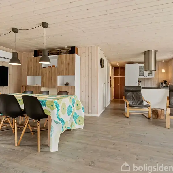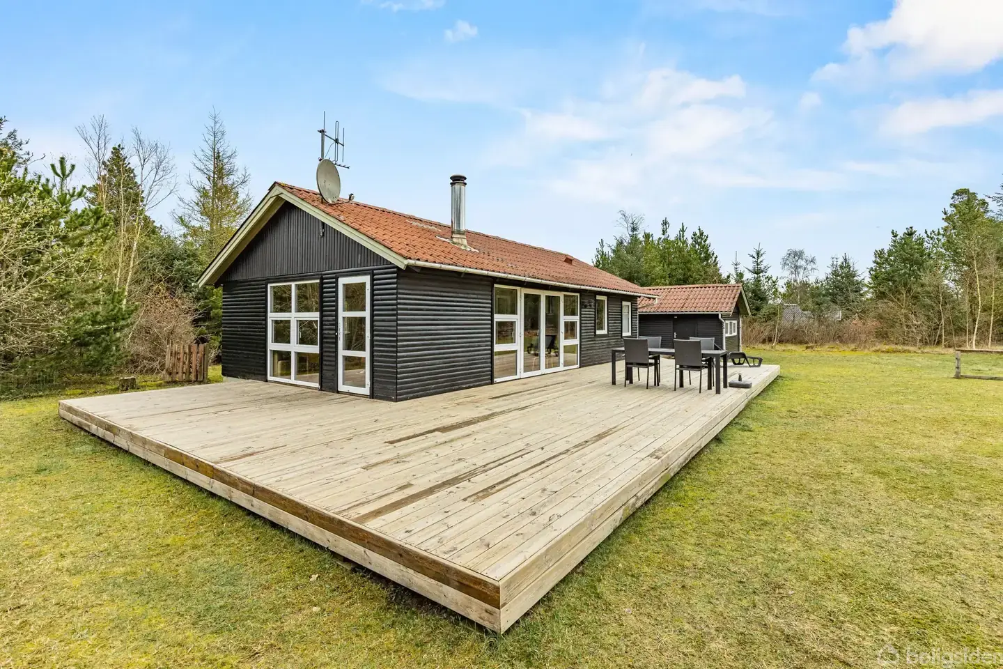 På stor, lukket og samtidig meget børnevenlig naturgrund tilbydes et rigtig hyggeligt og indflytningsklart sommerhus. Huset er løbende renoveret, ligesom boligarealet er blevet udvidet, idet en del af den tidligere overdækning nu er medtaget i beboelsen. Dette har medvirket til, at der er masser af luft i køkken/alrummet. Huset er opført i vandretliggende og sortmalede blokhusbrædder og med tagbelægning af rødt eternit. Der er særdeles gode udearealer med træterrasse. Endvidere er der en tilhørende lukket garage. Mellem de to bygninger er der en dejlig læfyldt terrasse, ligesom der foran huset er træterrasse mod syd og vest. Huset er indrettet med en dejlig entré, stue med spiseplads samt opholdsafdeling med brændeovn. Delvist adskilt køkken, der er holdt i hvide elementer. Pænt badeværelse med skabsarrangement med spejl samt bruseafdeling. Køjerum med fire sovepladser. Soveværelse med dobbeltseng. Huset er tilmeldt udlejning via Esmark. Huset var i 2024 udlejet i 17 uger, hvilket indbragte 44.000 til ejer plus forbrug.