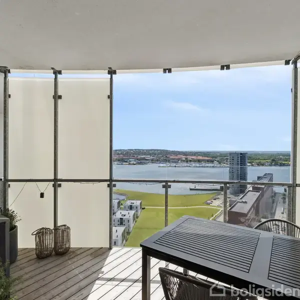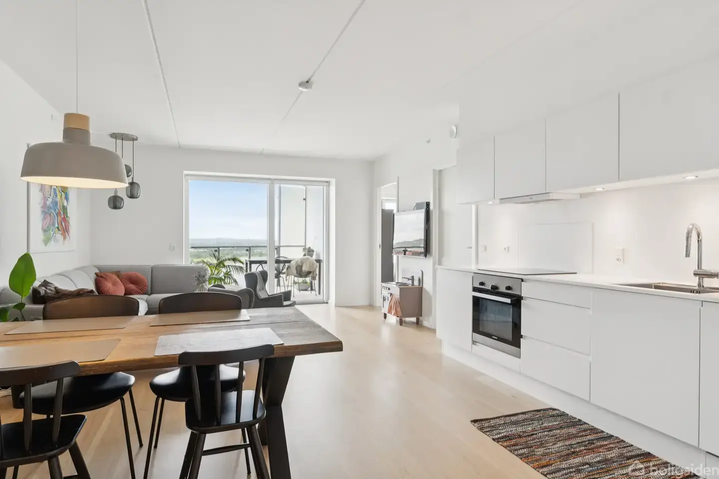 Drømmer du om at bo højt, lyst og moderne – med en udsigt der tager pusten fra dig? Så er denne lejlighed på Julius Posselts Vej 3A, 18. 1. noget for dig!Lejligheden er placeret på 18. etage i den ikoniske ejendom Horisonten og byder på en helt særlig atmosfære. Boligen er velindrettet med et åbent og indbydende køkken/alrum, hvor store vinduespartier trækker masser af lys ind og giver en storslået panoramaudsigt – i den ene retning strækker Limfjorden, udsigten til Egholm og de smukke grønne om