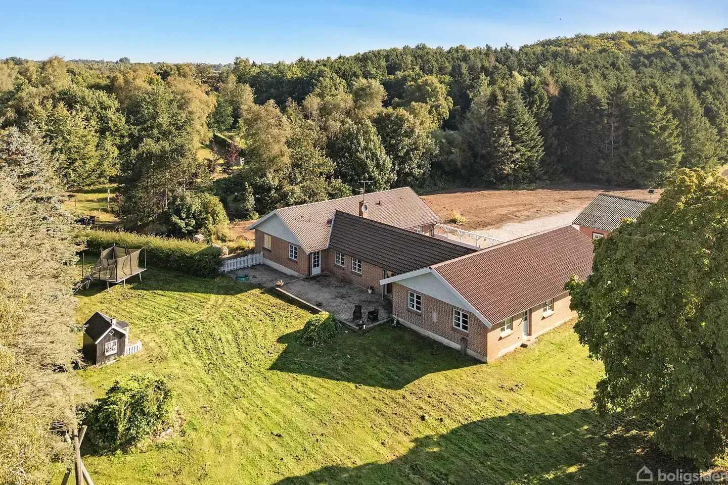 Midt mellem bløde bakker og åbne marker tæt på skovens grønne dybder finder du denne ejendom, hvor landlig idyl og uanede muligheder venter på den pladskrævende familie. Her forenes naturens skiften med en rolig hverdag, hvor livet leves i harmoni med omgivelserne. Boligen råder over 294 velindrettede kvadratmeter og ligger centralt på en naturrig grund på over 2,5 hektar, hvilket sikrer rigeligt med plads til både privatliv, udfoldelse og uforglemmelige stunder under åben himmel. Ejendommen fre