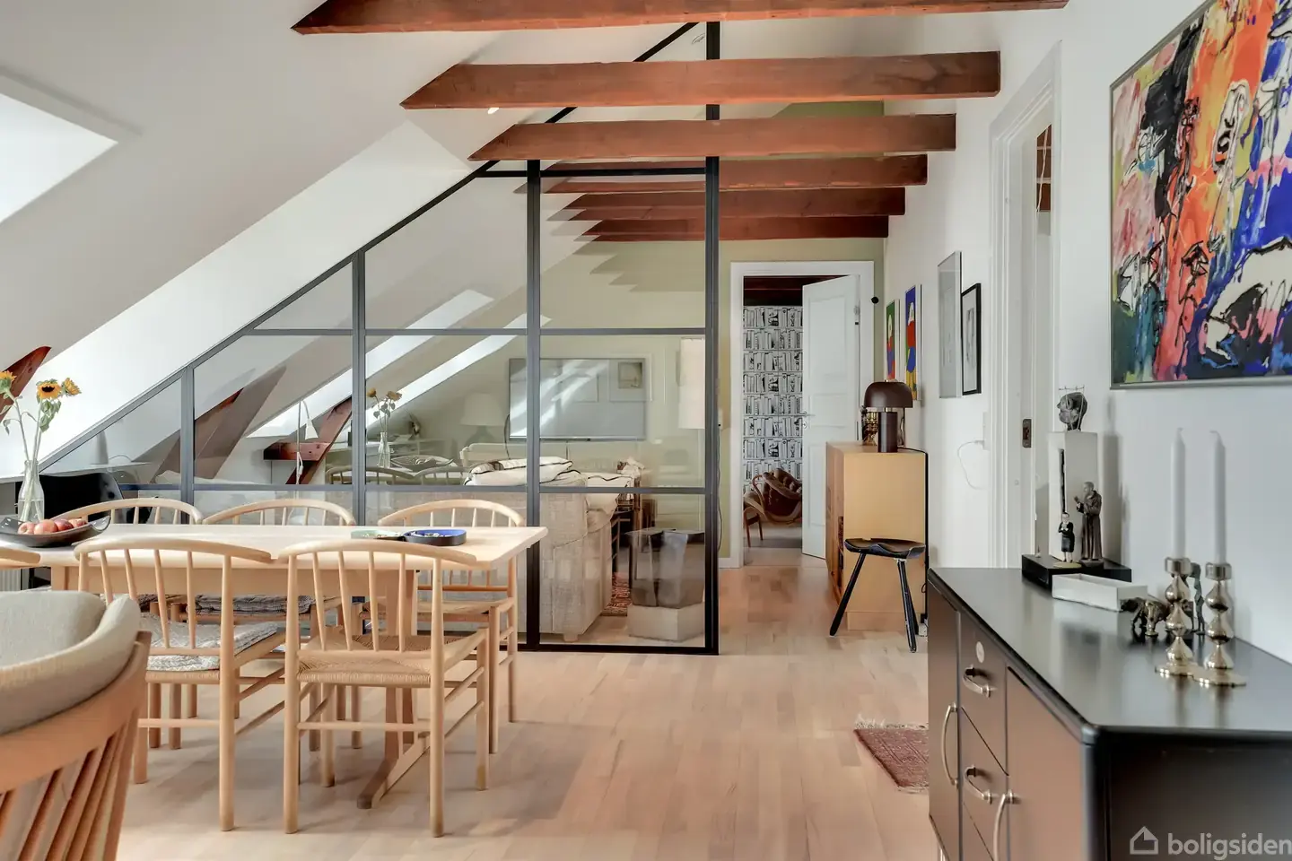 Lys taglejlighed med fritlagte bjælker og stor altan