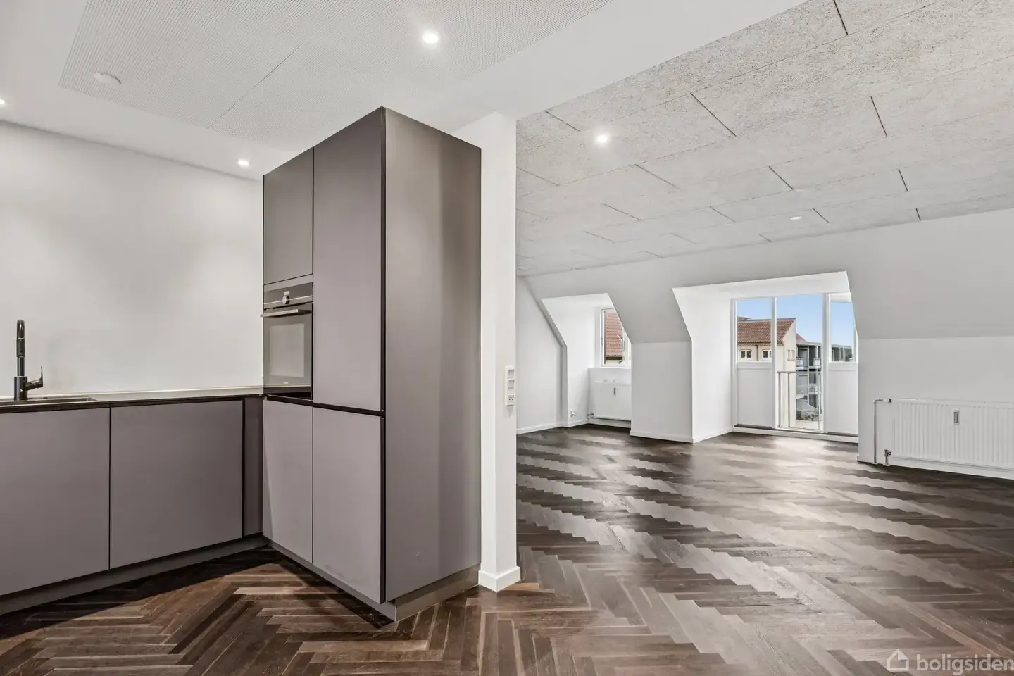 Velkommen til denne smukke og gennemrenoverede lejlighed, hvor kvalitet og stil går hånd i hånd. Boligen gennemgik en fuld renovering i 2021 og fremstår i dag som en moderne, lys og indflytningsklar lejlighed med nøje udvalgte materialer og gennemtænkte løsninger. Lejligheden byder på elegante trægulve lagt i sildebensmønster, som giver hjemmet et eksklusivt og tidløst udtryk. Det store, moderne køkken ligger i åben forbindelse med stuen og har et skønt lysindfald fra de charmerende kvistvindu