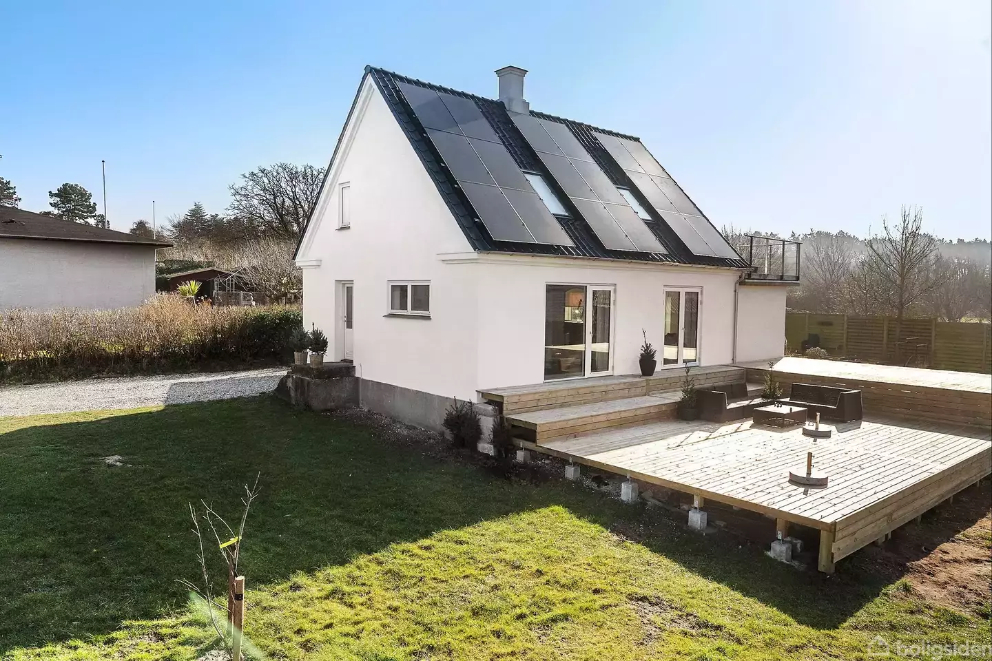 Velkommen til Kaasen 9, en gennemrenoveret og energivenlig villa beliggende i Kolby Kås på Sydøen; tæt ved havet, badebro og den flotte solnedgang. Fra huset er der ca. 7 km til Tranebjerg, Samsø hovedby hvor man finder indkøbsmuligheder, skole, fritidsaktiviteter, cafeer m.m. Nuværende ejere har siden købet i 2020 totalrenoveret huset ude og inde, og skabt en utrolig lækker og moderne bolig med gode løsninger og materialer. Boligen byder på hele 3 værelser, 2 badeværelser og gode opholdsrum hvilket giver masser af plads til både familie og gæster. De to stuer er med et flot sildebensparket på gulvet, masser af lys fra de store vinduer og med udgang til en stor træterrasse; bygget i 2024. Desuden brændeovn i den ene af stuerne. Det fine og praktiske køkken er fra Svane og ligger i åben forbindelse med stuen; her er der god bord- og opbevaringsplads. I huset er der hele to flotte badeværelser; ét på hver sin etage, så der er rig mulighed for at imødekomme familiens behov, hvilket gør hverdagen både lettere og mere praktisk. En af de store fordele ved denne villa er den økonomiske energiløsning, som sikres af en moderne luft til vand varmepumpe samt solceller; opsat i 2024. Dette gør det muligt at nyde et behageligt indeklima året rundt, samtidig med at forbrugsomkostningerne på el holdes på 0 kr., via en aftale som løber i alt 15 år, fra etableringsdatoen. Det gælder dog ikke forbruget på el-lade standerens om er placeret ude ved carporten. Boligen er lys og indbydende, og de mange vinduer sikrer et dejligt lysindfald i alle rum. Den tilhørende store have giver mulighed for at nyde udendørslivet, hvor der er plads til leg, afslapning og gode stunder med familie og venner. Her er der den store træterrasse, flere forskellige frugttræer, stor køkkenhave samt vildmarksbad. I forbindelse med indkørslen ligger et fint anneks med værelse og et badeværelse; annekset er ikke godkendt til beboelse i BBR. Fra carporten er der nedgang til en stor kælder, som rummer husets teknik; bl.a. inde delen til varmepumpen, eltavle, inverter til solceller og BWT-anlæg. Udvendigt har nuværende ejere skiftet taget til tegltag og pudset og malet huset, så det får et rent og moderne udtryk; desuden er stort set alle vinduer i huset skiftet. Huset er registreret som helårsbolig, men kan frit anvendes som fritidsbolig. På Samsø er der et væld af muligheder for aktiviteter, med b.la. velrenommeret 18-hullers golfbane ud til Samsø Bælt, verdens største labyrint, et rigt foreningsliv, afvekslende natur og mange forskellige kulturelle oplevelser i løbet af året. Fra Samsø er der gode færgeforbindelser fra Sælvig Havn til Jylland og direkte passagerfærge til Aarhus C. Derudover færge til Sjælland fra Ballen Havn.