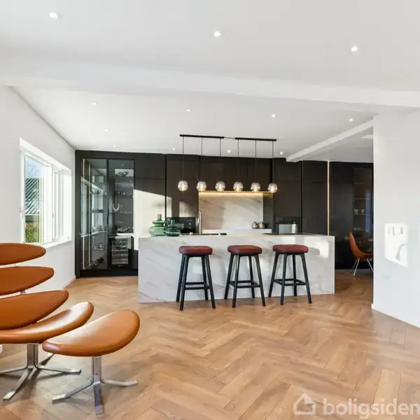 Turen går til Vanløse, hvor I skal se nærmere på en klassisk murermestervilla, der i 2025 blev smagfuldt opdateret inde og ude, så den i dag står fuldstændig indflytningsklar. Facaden er nybehandlet, vinduerne er udskiftet, og helhedsindtrykket er elegant, roligt og gennemført. Villaen ligger let tilbagetrukket på grunden, så I får glæde af både forhave og en ugeneret baghave, hvor hæk og høje træer indrammer udelivet. Herfra leder en flisebelagt sti frem til vindfanget og videre ind i hjemmets