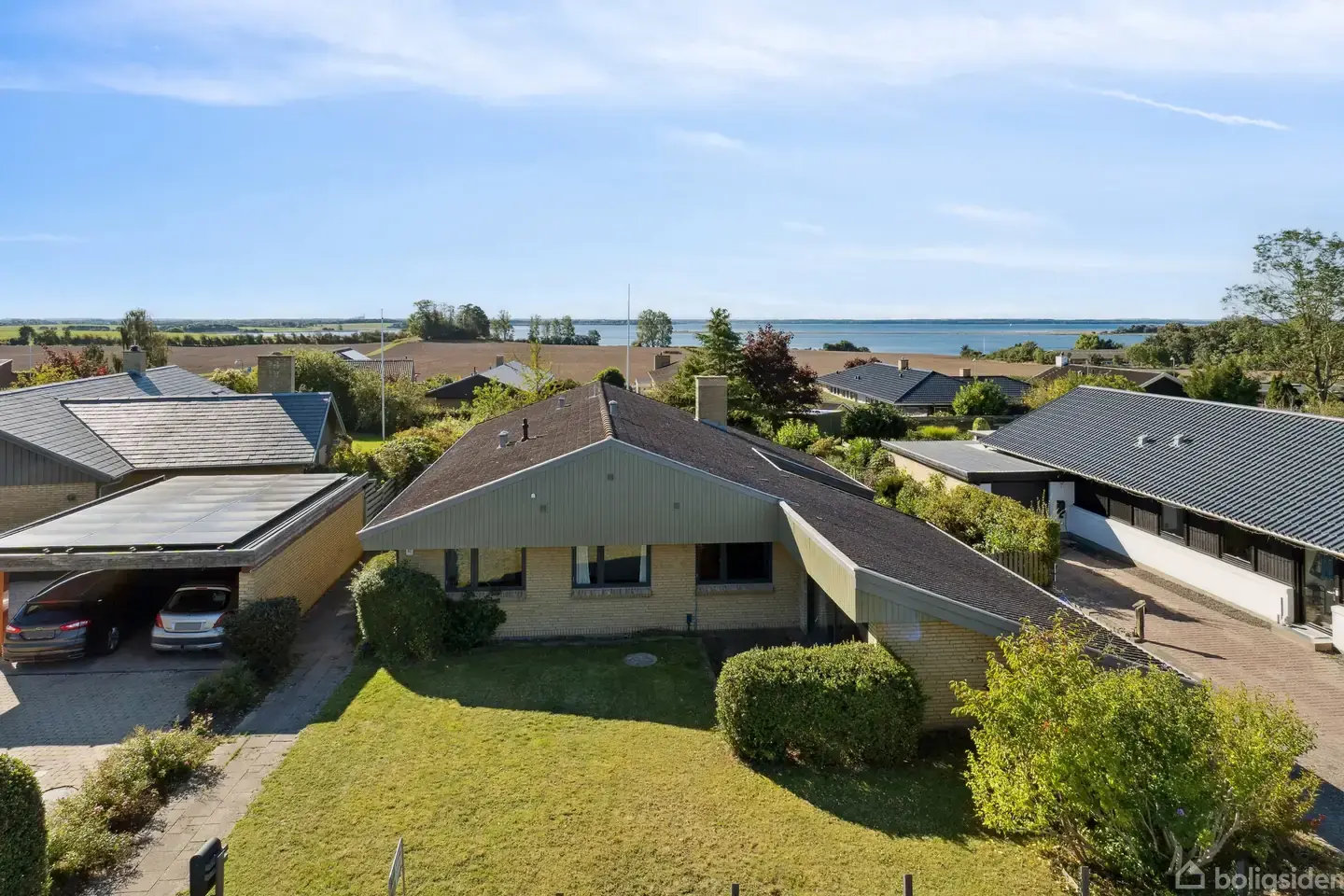 Her får I en rummelig og indbydende villa på 244 m², hvor det varme lys strømmer ind gennem store vinduespartier og skaber en hjemlig atmosfære med udsyn til vandet fra næsten alle opholdsrum. Bygget i 1972 og nænsomt renoveret i 1975 står huset med et klart 70’er-præg i materialer og trælofter, som giver karakter og varme, en sjælden ramme til familielivet i det rolige lystbådskvarter. Planløsningen favner både hverdag og samvær med to stuer, et køkken-alrum og en tydelig forældre-børneafdeling