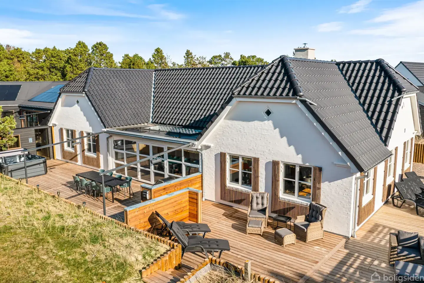 Her møder moderne komfort og hyggelig idyl hinanden i skøn forening. Huset på Kallesmærskvej 7B byder på 175 m2 lys og indbydende skandinavisk stil, hvor der er tænkt på alle detaljer for at skabe en afslappet atmosfære. Huset er beliggende i naturskønne omgivelser med store fredet arealer som nærmeste nabo og kun få minutters gang til hjertet af Blåvand. Ro og natur lige uden for døren og nem adgang til Blåvands pulserende byliv. Sommerhusets åbne planløsning forbinder det elegante køkken/alrum direkte med en indbydende opholdsstue og et aktivitetsrum med poolbord. Fra køkken/alrum er der direkte udgang til den rummelige terrasse, der er indrettet til ultimativ afslapning med både loungeområde, jacuzzi, sauna m.v. Huset byder på 4 værelser, alle med dobbeltsenge og faste skabe. 3 moderne badeværelser - alle med brus. Grunden er udlagt som delvis naturgrund, hvor der er gjort plads til legeplads for de mindste og beachvolleybane for de lidt ældre børn. Huset udlejes via Feriekompagniet - forhør nærmere. Her har du muligheden for at erhverve et flot renoveret sommerhus med enestående beliggenhed - skal vi mødes til en fremvisning?