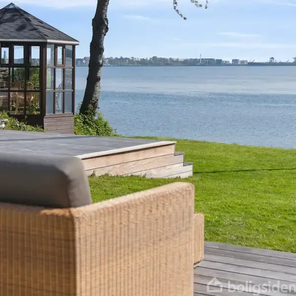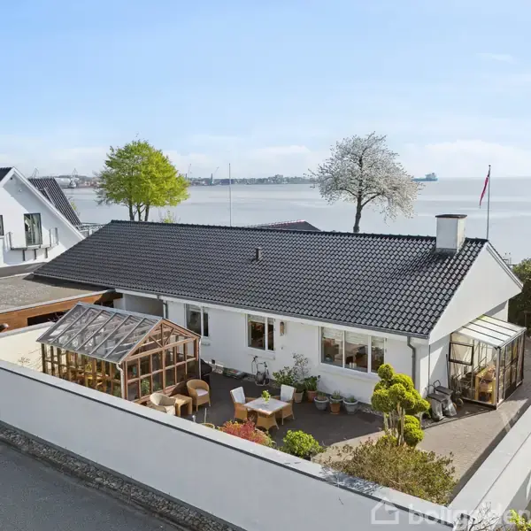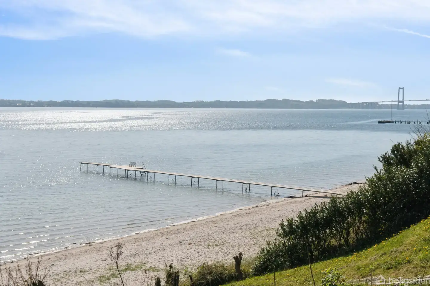 Det er ikke bare det faktum, at denne ejendom ligger i første række til Lillebælt. Det er nemlig også en væsentlig pointe, at villaen er højt placeret her i Sanddal. Det giver en privat og ugeneret fornemmelse, tilbagetrukket fra stranden, ligesom det skaber et helt ekstraordinært perspektiv på udsigten. Boligen er nydelig og velholdt, så den lever op til den fremragende beliggenhed. Inden døre er rumforløbet udført i ét plan med blandt andet fire værelser, og ude er haven fuld af stemning. Alt