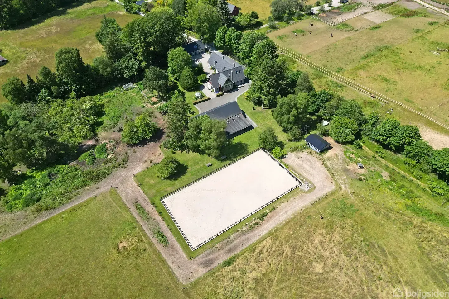 Et moderne landsted i Nordsjælland. Her er de bedst tænkelige rammer for den pladskrævende familie, der drømmer om højt til himlen og et utal af muligheder. Man bydes velkommen i yderst charmerende omgivelser og til et gårdspladsmiljø omkranset af boligerne og garagerne. Ejendommen kan dateres tilbage til år 1850 men en væsentlig om-og tilbygning i 2004 giver i dag en ny ejer muligheden for at kunne flytte ind i en moderne bolig med højt til loftet, et smukt lysindfald og ikke mindst nogle vidunderlige udsigter til den omkransende natur og egne jorde. I alt 343 boligkvadratmeter der i dag er opdelt i to separate boliger og derudover en yderlige disponibel lille lejlighed i den ene garagebygning. Den perfekte generationsejendom eller fine forhold til erhverv og udlejning. To luksus garagebygninger hvoraf den ene er opført i 2005 på 60 m2 + tilsvarende loftsrum og den anden opført i 1990 og i 2023 moderniseret og ombygget med en disponibel lille lejlighed. I alt 72 m2 Ydermere en meget charmerende staldbygning der i dag er indrettet med fire pony/islænder bokse, løsdriftsstald, garage og skur. I forlængelse heraf en yderst velbeliggende 20x40 ridebane. Et samlet jordtilliggende på 6,2 hektar der i dag byder på hestefolde, skovbryn og enge. Derudover en smuk have med gammel og blomstrende beplantning, nyttehave og på grunden også et unikt forrådskammer fra gammel tid.