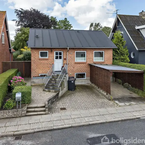 Åbent hus med tilmeldingskrav 10/2 - klik på billede - Kastanie Alle 36 er et godt bud på jeres nye hjem, hvis I ønsker et nemt og særdeles nydeligt hjem, hvor I får kort afstand til alt. Indenfor en kilometer er der skole, arena, uddannelse, indkøb, gågade, grønne områder og fjorden med strandpromenade. Med så central en beliggenhed bliver det ikke nemmere. Der venter jer en flot villa rødstensvilla fra 1953, som står med nyere listetagpap. Huset rummer 154 m2, hvor 86 m2 er i stueplan og 68 m2 i rigtig fin underetage med god loftshøjde. Villaen er pænt renoveret i de senere år med bl.a. køkken, vinduer og døre samt tag. Boligen fremtræder således overalt lys, venlig og meget indbydende overalt. Derfor er huset helt klart til at rykke ind i fra dag 1. Huset er oplagt til enlige, par og seniorer, da bad og soveværelse er i stueplan. Foran huset er carport på 18 m2. For enden af haven er et fint udhus på 28 m2, som kan bruges til havehus, værksted, opbevaring o.lign. Indretning: Indbydende entré med trappe til underetage samt adgang til pænt badeværelse med bruseniche. I åben forbindelse med entré er stue samt det flotte, hvide køkken. Super dejligt køkken med god skabsplads og spiseplads. En hyggelig og rummelig vinkelstue med skønt lysindfald og herlig udsigt over den flotte have. Kan I løsrive jer fra stuen, så kan I bevæge jer udenfor på den flisebelagte, sydvendte terrasse i haven. Fra stue er ligeledes adgang til dejligt soveværelse med skabe. Underetagen indeholder WC, gang med dør ud til indkørslen, bryggers/fyrrum og 4 disponible rum. Alle i rigtig pæn og brugbar stand og med regulære størrelser, så de kan anvendes til mange formål – bl.a. kontor, liberalt erhverv, hobbies, teenageafdeling, gæsteværelse m.v. Foran huset er flisebelagt carport, holdeplads indgangsparti og et fint lille bed. Omme bag huset venter jer en super dejligt have, der er sydvendt og helt ugeneret. Her er stor flisebelagt terrasse ved huset, hvor en del er overdækket og med vintræ. Her finder I skønne bede langs hækken, hvor der er et væld af farver. Rundt om i haven er skønne lækroge. I bunden af haven er udhus samt højbede, så denne del af haven er oplagt til de grønne fingre. Hele herligheden forbindes af en regulær græsplæne, der indbyder til bold og leg. En rigtig fin og indflytningsklar villa, hvor alt er lige i nærheden – nemmere bliver det ikke!
