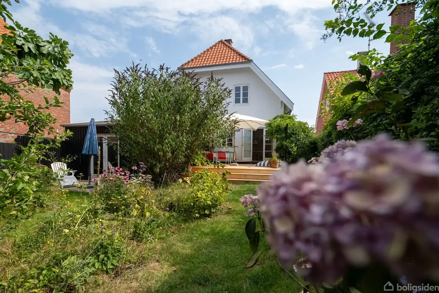 Klassisk murermestervilla på toppen af Gudhjem På toppen af Gudhjem ligger denne smukke murermestervilla fra 1910 – en bolig, der forener klassisk gedigent byggeteknik med en sjælden fornemmelse for farver og stemning. Facaden står fornem, rank og tidløs med sprossede vinduer, rødt tegltag og en form, der på én gang er elegant og solid. Det er den type hus, der altid vil føles hjemme i landskabet – uanset tidens skiftende trends. Indenfor åbner der sig en verden af sanselighed og genialitet, der går langt ud over det forventelige. Her er højt til loftet, luft og lys, men først og fremmest en æstetik, der inspirerer. Farverne er valgt med stor raffinement, så hvert rum fremstår som et selvstændigt udtryk og alligevel er del af en gennemført helhed. Det er et hjem, der taler til både øjet og sindet. Husets hjerte er køkkenet, hvor varme toner og en bordplade i egetræ giver rummet både funktion og karakter. Herfra er der udgang til haven – et lille univers i sig selv. I det fjerneste hjørne står et gammelt figentræ, som gennem årene har slået rødder og vokset sig til et frodigt vartegn og læhegn. Sammen med øvrige smukke planter skaber det en lille privat byoase. På første sal findes tre regulære værelser samt et badeværelse. Herfra har man udsigt over Gudhjems tage og et blik mod havet, der giver huset en særlig poesi. I stueetagen – forskudt i plan – er der i dag indrettet et lydstudie med direkte udgang til lille privat træterrasse, toilet og med nedgang til kælderen. Det giver en ekstra dimension til boligen: plads til at skabe, arbejde eller indrette efter helt egne behov. Med istandsatte gavle i 2024 og et snedkerkøkken fra 2019 er huset nænsomt opdateret og står klar til nye ejere. Kastanjevej 5 er et hjem, der kunne ligge hvor som helst i verden og stadig vække samme fornemmelse: et hus, man ville ønske at eje, fordi det taler til både øjet og sindet og sætter sig i kroppen længe efter, man har forladt det. Men netop dette hjem ligger i Gudhjem – en af Danmarks smukkeste byer. Her, hvor klipperne møder havet, hvor lyset er legendarisk, og hvor byens mennesker er mindst lige så hjertelige, som byen selv er æstetisk. Det gør helheden fuldendt. Et sjældent sted. Et sjældent hus.