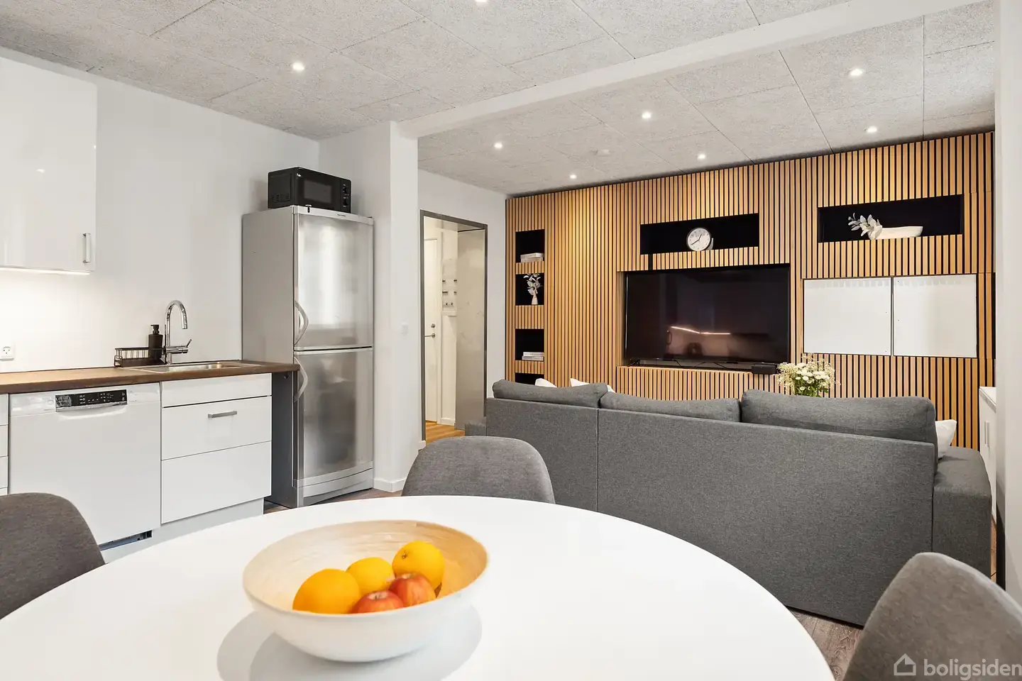 Så snart man træder ind i stuelejligheden på Katrinegade, bliver man blæst fuldkommen bagover af den moderne indretningssans, der fylder hver enkelt kubikcentimeter. Man har gjort en dyd ud af at renovere lejligheden, så der hersker en rød tråd fra start til slut, hvor man kan flytte direkte ind og hurtigt indrette sig, som boede man i et boligmagasin. Lejligheden placerer sig i den gråmalede del af ejendommen, der deles om den samme lille gårdhave med fliseareal til havemøblementet og grøn plæ