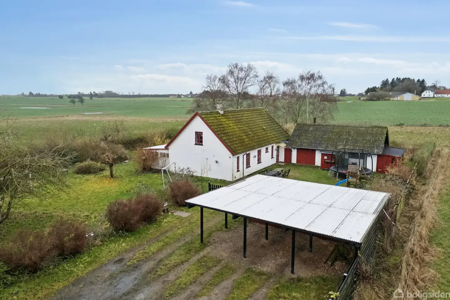 På en stor grund lige uden for landsbyen Gimlinge ligger en charmerende ejendom med frit udsyn over marker og natur. Her får du et hjem med sjæl, fleksible indretningsmuligheder og god plads både inde og ude, ligesom der medfølger et skønt udhus med eget køkken og bad. Glæd dig til tilværelsen i de fredelige omgivelser, hvor du kan udfolde enhver pladskrævende hobby eller måske endda et erhverv. Boligen består af en funktionel planløsning med store, lyse rum. I stueplan finder du en indbydende