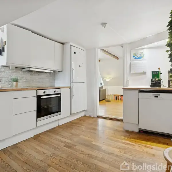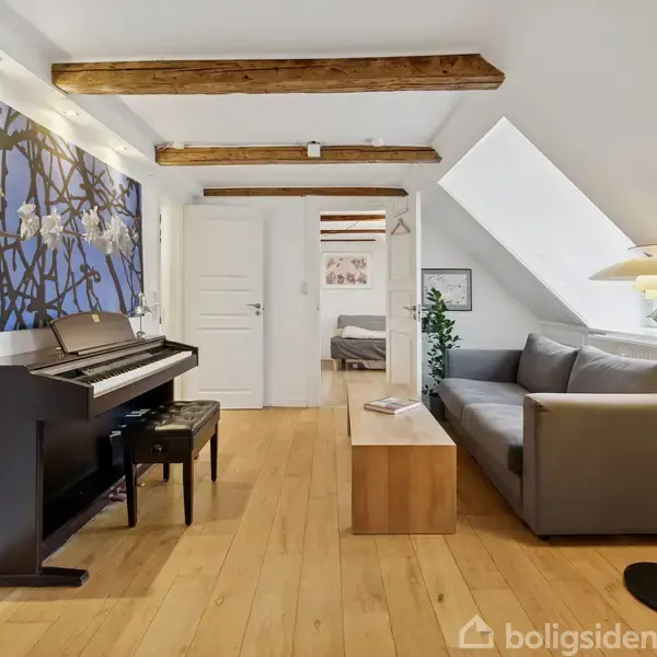 3-værelses bolig i fredet ejendom med udsigt over byen Denne lejlighed er beliggende øverst i en fredet ejendom fra 1799 og tilbyder 95 m² bolig med skråvægge, kringelkroge og en særlig stemning, som kun opstår i huse med historie. Her bor du i hjertet af København, hvor byens liv opleves tæt på, men uden at dominere hverdagen. Københavns Byret optager hele gadens ene side og bidrager til, at Kattesundet er en af de roligere gader midt i byen, mens Gammel Strand, Strøget, Rådhuspladsen og Tivoli ligger tæt på og gør hverdagen nem og levende. Lejligheden rummer tre værelser og er præget af autentiske detaljer som fritlagte loftsbjælker, skæve vinkler og en fungerende pejs, der understreger bygningens alder og karakter. De skæve vægge giver boligen et personligt udtryk og skaber hyggelige rammer, som adskiller sig markant fra nyere byggeri. Boligen begynder i en entré med plads til opbevaring og videre adgang til et rummeligt soveværelse, hvorfra der er udsigt til Rådhustårnet, en markant og genkendelig del af bybilledet, som kan nydes ud af vinduet eller siddende i den brede vindueskarm. Fra entréen er der også adgang til stuen med plankegulve og to brede vinduesnicher samt pejsen. Fra stuen er der adgang til endnu et værelse, som kan indrettes fleksibelt, eksempelvis som kontor eller gæsteværelse. Køkkenet har en praktisk placering i forlængelse af stuen, og badeværelset vender mod den charmerende gård. Lejligheden opleves privat, uden indkig fra naboer, og der er et tilhørende opbevaringsrum i gården. Den fredede status medfører særlige forhold, herunder skattefordele, som er værd at tage med i overvejelserne. En bolig for dig, der ønsker en veldisponeret lejlighed med historie, privatliv og en central beliggenhed i København.
