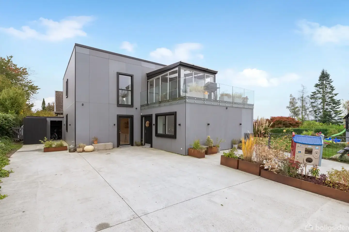 Velkommen til en moderne og rummelig villa fra 2017 på hele 220 m² fordelt over to etager, beliggende på en velanlagt grund på 750 m² med flot udsigt til grønne omgivelser. Huset fremstår med et elegant og enkelt design, store vinduespartier og et lyst, åbent udtryk, der skaber en behagelig atmosfære fra det øjeblik, man træder indenfor. Fra indkørslen møder I en bred, flisebelagt forplads og en gennemtænkt opdeling mellem ankomst og have, så hverdagens logistik fungerer let og praktisk for hel