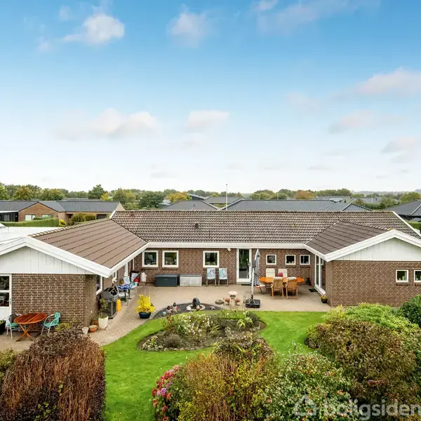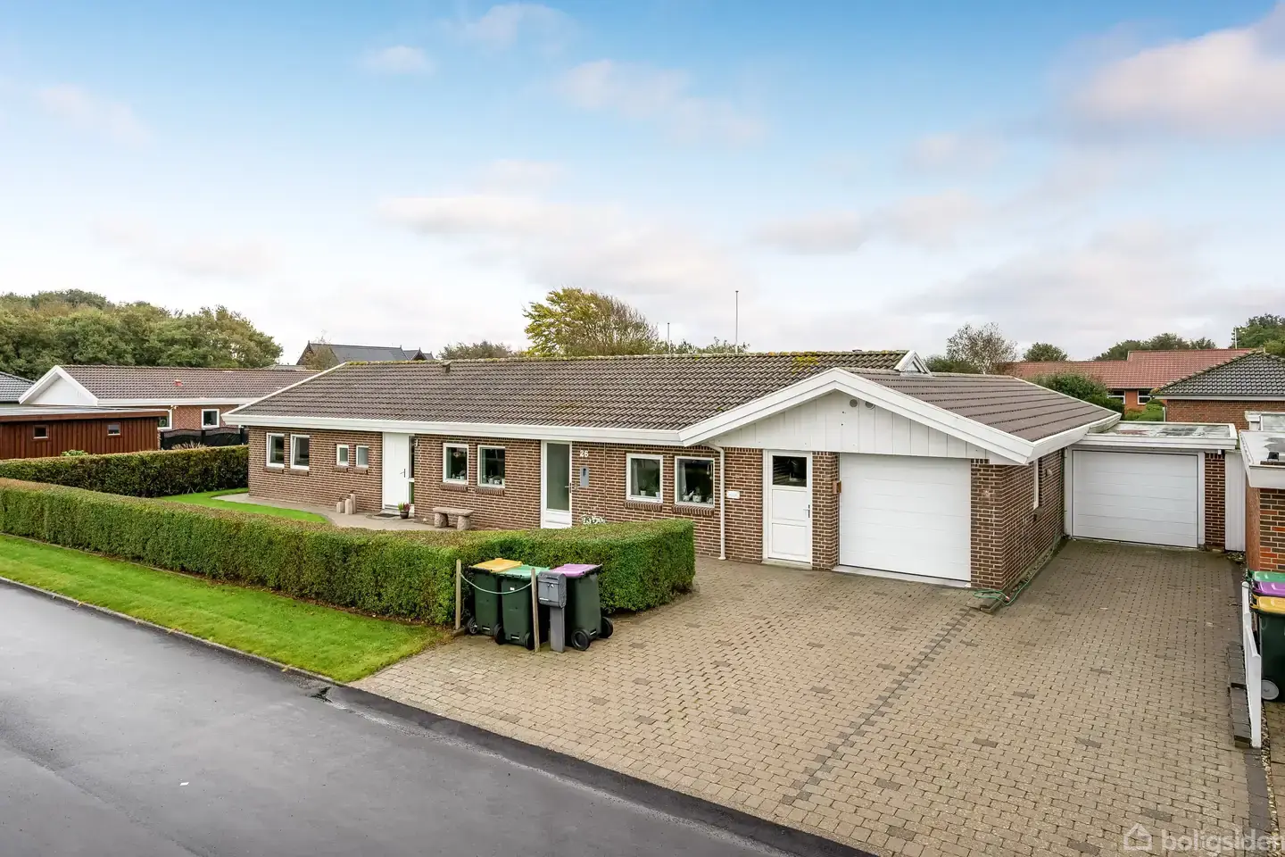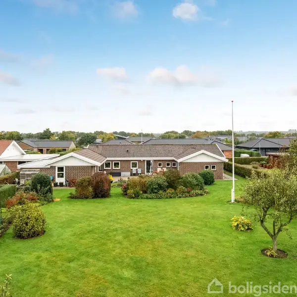 Rummelig Eurodan-villa med stor garage og hobbyrum på attraktiv dobbeltgrund På en veldisponeret dobbelt grund på 1.417 m² ligger denne Eurodan etplansvilla fra 1986 på 151 m² med 4 værelser og 2 badeværelser. Husets første indtryk er det sammenhængende facaderum og den store indkørsel med adgang til en helt unik isoleret og opvarmet hobbyrum samt garage/værksted på i alt 91 m2. Indgangspartiet fører ind i et hjem, hvor rummene er fordelt praktisk med gode forbindelser mellem ophold, køkken og