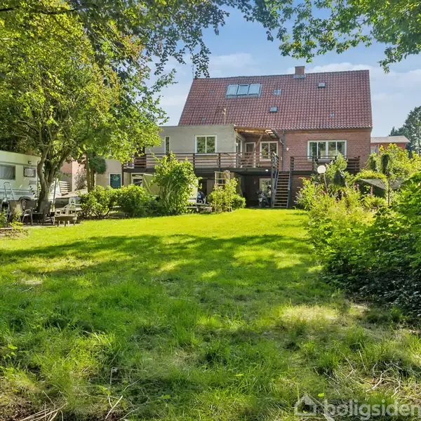 Lige i hjertet af Gram ligger denne store ejendom og lokker med intet mindre end 584 etagemeter. Med andre ord er der mere end nok plads til familien, til hobbylivet og endda også til butikken og i det hele taget til det liberale erhverv. I 1950 blev rødstensejendommen opført, og i 1994 blev den tilbygget. Den tager sig gedigen og nydelig ud i sine røde sten og røde tegl, og mens der ud mod gaden både er indgang til bolig og til et muligt erhverv, får man inde bagtil afsæt til en meget, meget hy