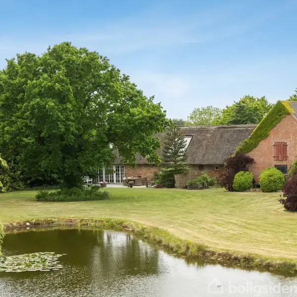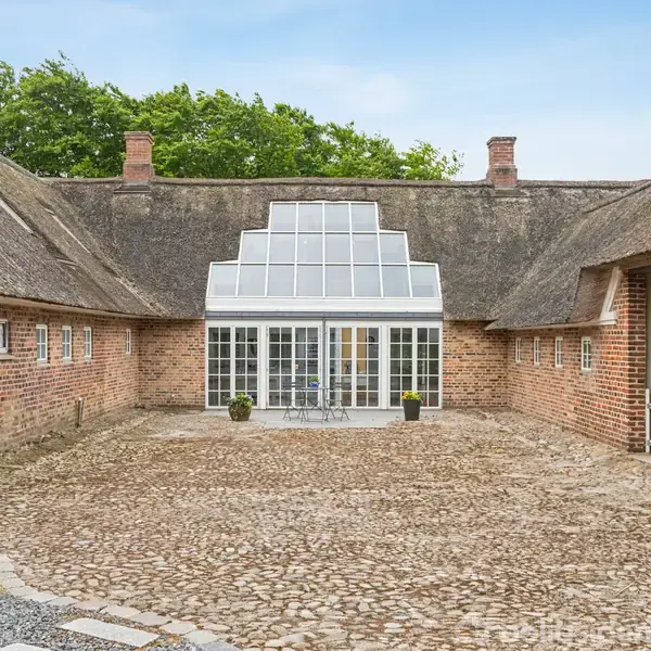 Det tykke stråtag hviler tungt på de røde mursten. Patineringen af stenene fremhæver den lange historie, som den gamle, hyggelige gård har undergået siden 1880, hvor den blev opført, og de hvide bondehusvinduer fuldender udtrykket. Udefra får man næsten det indtryk, at ejendommen står i de originale klæder, men takket være løbende istandsættelser og ombygninger, senest i 2009, vil man opleve en elegant balance mellem nutidig komfort, moderne materialer og oprindelige detaljer. Ejendommen passer