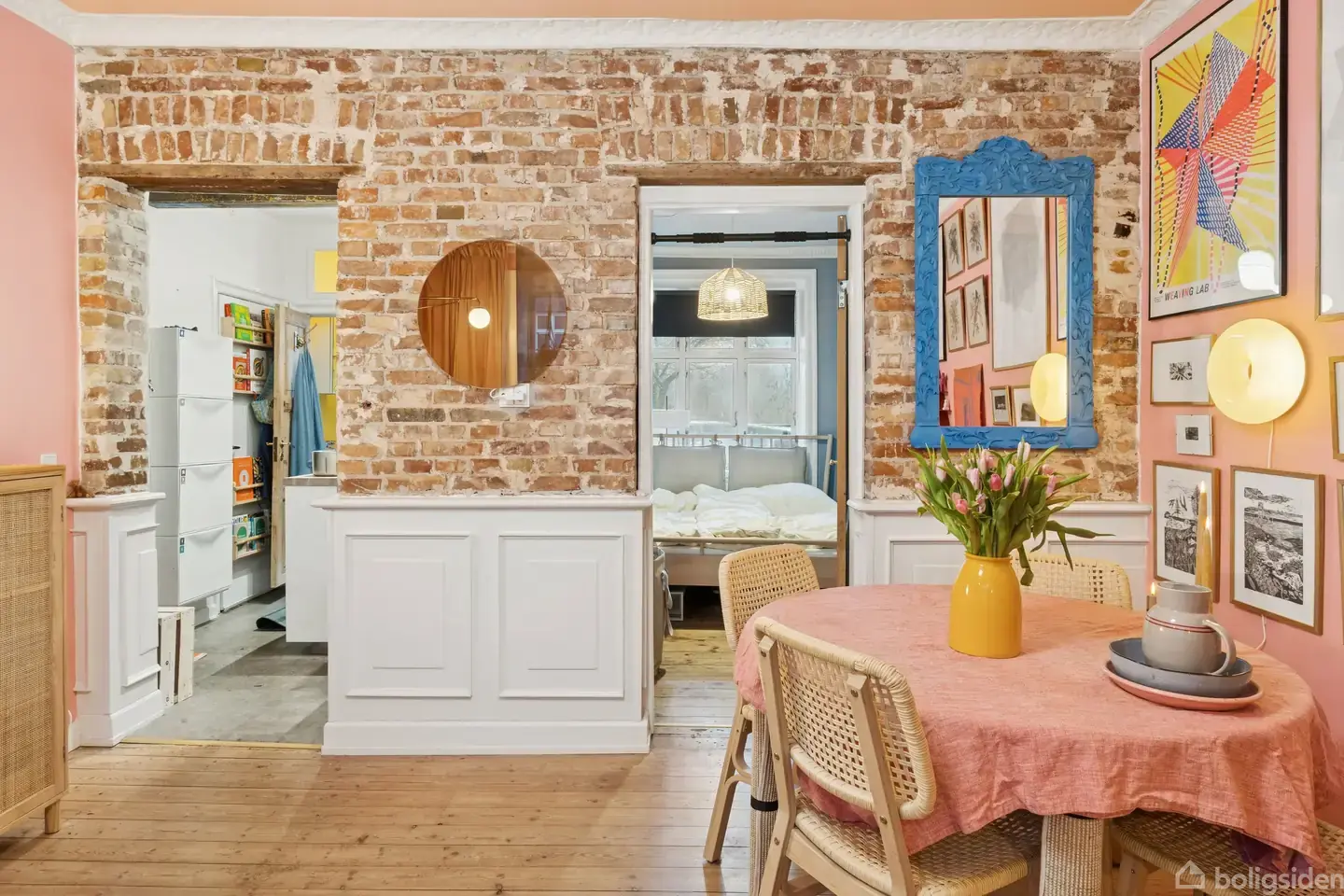 Høj og hyggelig stuelejlighed på Amager Midt på Amager, få skridt fra Amagerbrogade, ligger denne lejlighed højt i stueetagen i en velholdt rødstensejendom fra 1903. Der er tale om en pæn, lys og stemningsfuld bolig, som består af to værelser, et køkken og et badeværelse. Derudover er der brugsret til et kælderrum, som du nemt kan tilgå ad bagtrappen. Det største værelse i lejligheden er oplagt som dagligstue, hvor rustikke og elegante detaljer er kombineret med en farverig indretning. Der er fu