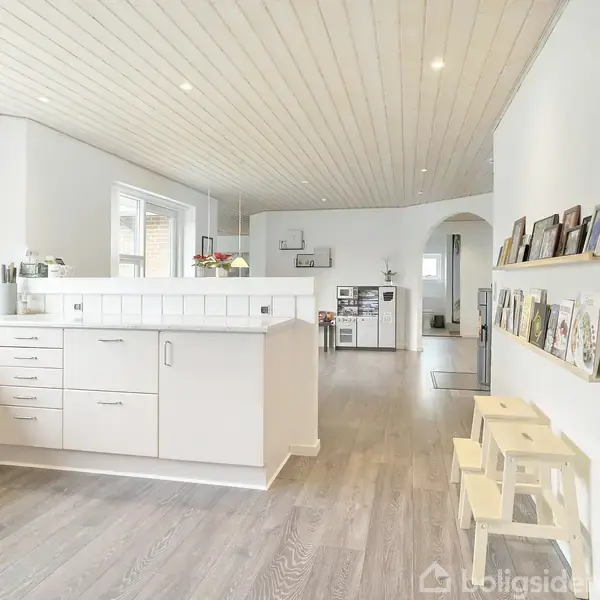 Velkommen til Kirketoft 74 i Asp - her finder I en moderne og indflytningsklar familievilla fra 1997, der fremstår flot, lys og velholdt. Boligen rummer 158 kvadratmeter i ét plan og er indrettet med fokus på både funktionalitet og familieliv. Allerede ved ankomsten møder I en god indkørsel med integreret carport, som gør det nemt at parkere og samtidig giver tør adgang direkte til bryggerset. Villaen er udstyret med et solcelleanlæg på 6 kW fra 2012, hvilket bidrager til en mere økonomisk og en