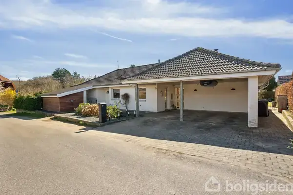 I får her et virkelig fint og indflytningsklart hus, beliggende i et rigtig dejligt område centralt i Stensved på en lukket villavej, i gå/cykelafstand til både indkøb, skole, fritidsaktiviteter, offentlig transport og naturskønne områder mm.Udover husets hoved indgang/entre er der, fra den store dobbelt carport direkte adgang til husets bryggers, som også giver videre adgang til huset.Bryggerset har både skabsplads, plads til vaskemaskine/tørretumbler m.m. Køkkenet ligger i åben forbindelse til