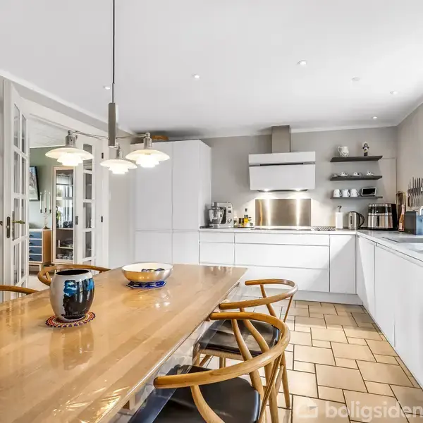 Moderniseret villa med Vordingborg køkken fra 2023 og energivenlig varmepumpe.