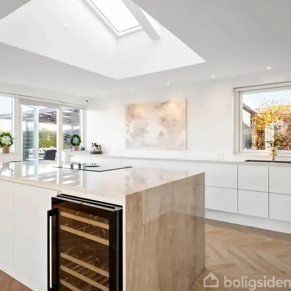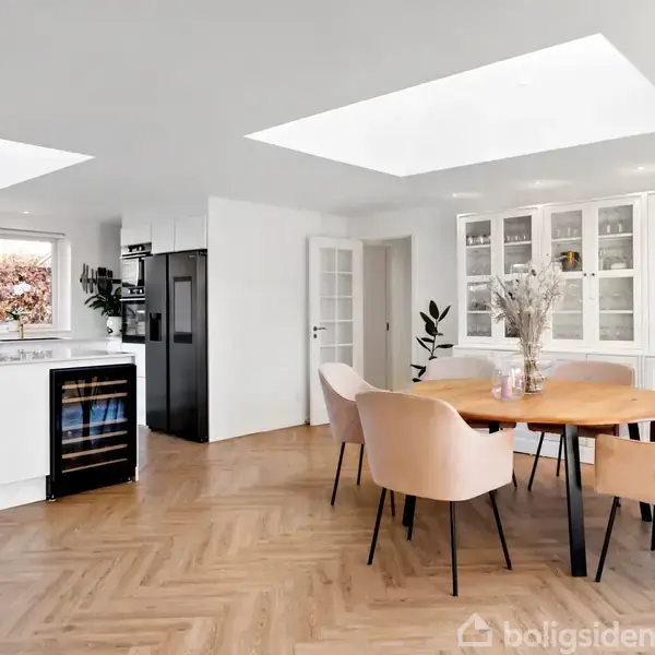 Lysindfaldet er fremragende i denne elegante og gennemrenoverede villa, der ligger godt placeret på en rolig villavej i Tulstrup – et hyggeligt og børnevenligt lokalsamfund lige uden for Hillerød. Det gælder ikke mindst i det dejlige opholdsmiljø med ovenlysvinduer, der også har store vinduespartier mod terrasse og have. I hele boligen er der flotte gulve i sildebensmønster, og planløsningen sætter en komfortabel ramme om familiens daglige liv. Der er desuden gulvvarme i hele huset, og det opvarmes med luft-til-vand varmepumpe. Boligen indeholder herudover tre værelser med mulighed for at etablere et ekstra, hvis I deler det store soveværelse op i to. Endelig er der et bryggers, et badeværelse og et gæstetoilet. Villaen blev renoveret fra A til Z i 2022, og det er en topmoderne familiebolig, der byder velkommen. I kan blandt andet glæde jer over blødgøringsanlæg, app-styring til el og gulvvarme i hele huset. Køkken-alrummet er et naturligt omdrejningspunkt for familiens daglige liv. Køkkenet er fra Designa med Dekton-bordplader, der er meget nemme at vedligeholde. Der er åben forbindelse til opholdsstuen, som har loft til kip og udgang til den store sydvestvendte terrasse i husets vinkel. Fra køkkenet er der desuden udgang til en terrasse med morgensol, så I får rig mulighed for at nyde solen fra morgen til aften. Der medfølger et isoleret skur med mulighed for at indrette værksted. Der er kort gåafstand til daginstitution, og de lidt ældre børn kan cykle til Alsønderup Skole. Der er ti minutters kørsel til Hillerød og en halv time til København. Velkommen til Kløvervej 10.