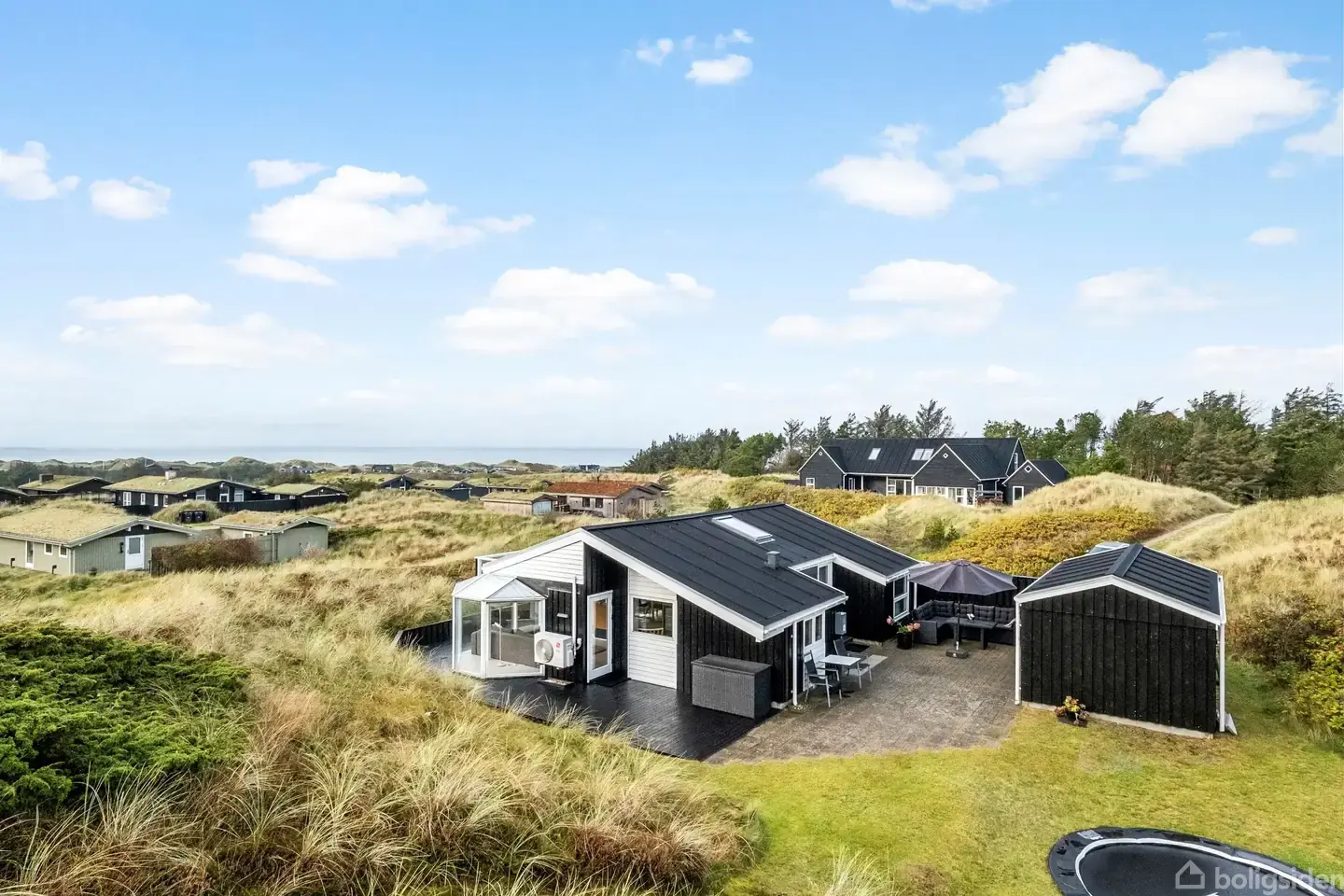 Åbent hus med tilmeldingskrav 21/2 - klik på billede - Velkommen til et helt særligt sommerhus i Blokhus – et sted, hvor himmel og hav mødes, og hvor du hver dag kan vågne til lyden af bølgerne fra Vesterhavet. Huset ligger højt og frit med en enestående udsigt over både klitterne og havet, og den unikke beliggenhed skaber en ro og atmosfære, du kun finder her på Vestkysten. Indenfor mødes du af et lyst og indbydende hjem med et nyt, lækkert køkken/alrum, hvor madlavning og samvær går hånd i hånd. Den hyggelige opholdsstue indbyder til afslapning eller til en rolig stund med udsigt gennem de store vinduespartier. Sommerhuset rummer tre gode værelser og et pænt, lyst badeværelse – alt fremstår velholdt og klar til både ferie og helårshygge. Udenfor venter flere solrige terrasser, hvor du kan følge solen fra morgen til aften, mens du mærker den friske havluft og duften af klit og marehalm. Den private grund giver både ro og god plads til leg, afslapning og hyggelige stunder. Her findes også carport og udhus med ekstra opbevaringsplads. Som prikken over i’et ligger husets udsigtsbænk – et helt særligt sted, hvor du kan nyde det storslåede vue over klitterne og det brusende Vesterhav. Et sommerhus som dette er sjældent – perfekt til dig, der drømmer om ægte vestkyststemning, moderne komfort og naturen lige uden for døren.