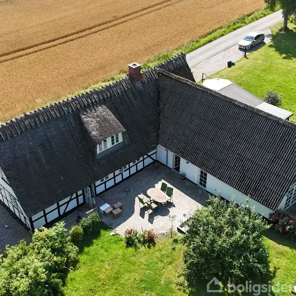 Her får I en charmerende og nænsomt renoveret bindingsværksejendom midt i det åbne landskab – med frit udsyn til grønne marker, en levende mose, og skoven i horisonten. Beliggenheden på en fredelig, lukket vej skaber en særlig ro, hvor naturens lyde tager over. Mod øst breder mosen sig som et levende maleri, der skifter farver og karakter med årstidernes skiften. Mod vest kan I nyde udsigten over ejendommens egne 3 hektar jord som en grøn oase omkring jer. Ejendommen er ideel for familien, der ønsker albuerum – både ude og inde. I stueplan venter et smukt og lyst køkken-alrum i forskudte plan, som danner husets naturlige samlingspunkt. Herfra er der direkte udgang til flere terrasser mod syd, øst og vest – oplagte til morgenkaffen, leg i haven og lange sommeraftener med grill. Et par trin oppe finder I den hyggelige stue med udsigt til haven og marken, mens stueplan desuden byder på endnu et åbent køkken, to badeværelser med brus, bryggers og to værelser. På første sal venter to store værelser og en stor opholdsstue med fleksible indretningsmuligheder – hjemmearbejdsplads, kreativt værksted, teenagestue eller legerum. Huset er i dag indrettet som to-familiebolig, hvilket giver masser af muligheder: Flere generationer under samme tag, teenagere med egen afdeling, hyggelig bed-and-breakfast midt i naturen langs øhavsstien, eller blot albuerum til den pladskrævende familie. Haven er let at holde, men rig på stemning: Frugtræer, vilde hjørner til dyreliv og gode græsplæner til leg og afslapning. De 3 hektar land inviterer til hobbylandbrug, køkkenhave, hestehold eller blot grønne drømme i fuldt flor. Ejendommen byder endvidere på 61 m2 udhus, som har mange anvendelsesmuligheder. Beliggenhenheden er i top: Bare en kilometer til Ollerup Sø, fem minutter til stranden og det hyggelige maritime miljø i Ballen, og gode mountainbike-spor i skovene ved Hvidkilde Gods. Til Svendborg er der under 15 minutters kørsel, og motorvejen mod Odense er let tilgængelig.
