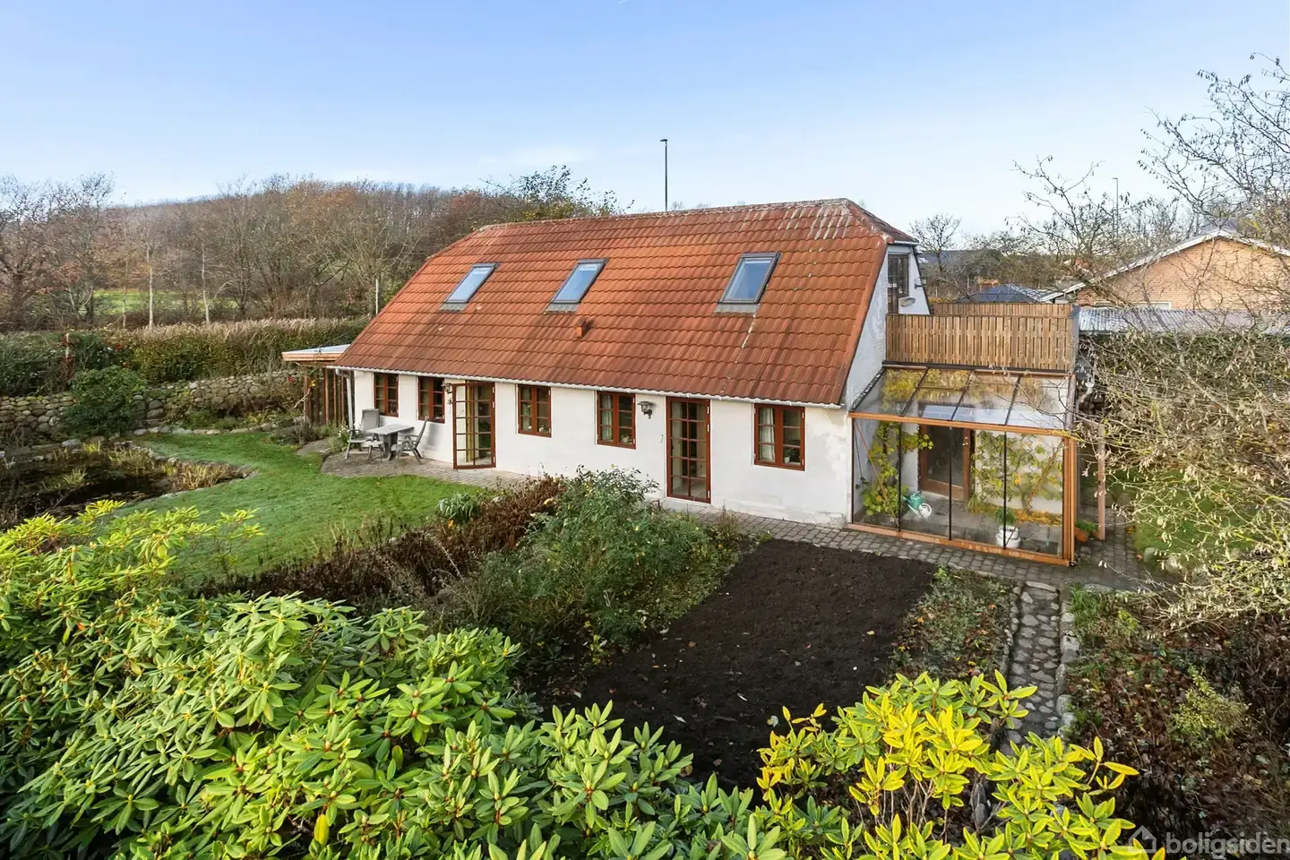 Åbent hus med tilmeldingskrav 3/2 - klik på billede - På et roligt og lukket vænge, i umiddelbar nærhed af de naturskønne Lundby Bakker, ligger denne charmerende villa, der gennemgik en gennemgribende renovering i 1999 og i 2025 fik monteret nye træ/alu-vinduer. Her får du et velindrettet og indflytningsklart hjem med en skøn, privat beliggenhed. Stueplan: Vindfang. Entré med trappe til 1. sal. Pænt køkken i åben forbindelse med alrum og stue, hvorfra der er udgang til en hyggelig udestue. Derudover rummer stueplan et soveværelse med faste skabe samt et stort badeværelse med bruseniche, vaskesøjle og helstøbt håndvask i praktisk skabsarrangement. Hele etagen har gulvvarme. 1. sal: På overetagen finder du en lys stue/multirum og et stort værelse med fast skab og direkte udgang til en skøn tagterrasse. Udearealer og ekstra faciliteter: Haven er en lille oase med orangeri/drivhus og to havedamme. Hertil kommer et rigtig godt udhus med klinkegulv, køkkenelementer og varmt vand (el) – perfekt til hobby, opbevaring eller værksted. Derudover er der en carport. Villaen er godt afskærmet fra naboerne og ligger i kort afstand til både natur, golfbane og øvrige fritidsmuligheder.