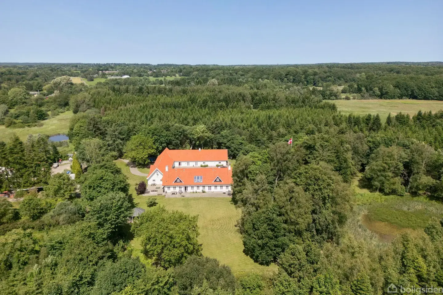 Velkommen til ”Timesgaard” Her kan drømmen om den store klassiske landvilla i Nordsjælland indfries. Diskret beliggende liebhaveri i Fredensborg omgivet af en parklignende grund med sø. Man bydes velkommen via den stemningsfulde vognport til en drøm af en brostensbelagt gårdsplads omgivet af stuehuset og de omkringliggende smukke længer. Fremstår i sin helhed smukt og klassisk med hvidpudsede facader, sprossede vinduer og røde tegltage. ”Timesgaard” kan historisk dateres tilbage til år 1898 men i1975/1980 opføres ejendommen som den kendes i dag. Er igennem mange år løbende ombygget og renoveret og ydermere i sælgers ejertid, blandt andet, også energioptimeret med nyt jordvarmeanlæg. Stuehuset byder i dag på en imponerede hall, værelse og gæstetoilet. Køkken/alrum og stue med åbne pejse, gennemgående massive plankegulve og udgange til de omkringliggende terrasser og haven. Første sal indrettet med stor møblerbar repos, masterafdeling men stort badeværelse og påklædningsrum samt afdeling med to værelser og dertilhørende badeværelse. Stort bryggers med selvstændig indgang, vaskerum og viktualierum. Ydermere udgang til selvstændig vognportsafdeling, der i dag er indrettet til træningsrum med tilhørende toilet. I alt 369 m2 bolig. Overalt højt til loftet, vidunderligt lysindfald og skønne udsigter til haven og gårdspladsen. På modsat side af vognporten dobbelt garage og en drøm af en længebygning på i alt 346 m2 samt uudnyttet loftrum. I dag indrettet med store disponible rum, badeværelser og toilet, tekøkken, vaskerum og teknikum. En drøm for den pladskrævende familie og mulighed for virksomhed hjemme i yderst repræsentative omgivelser.