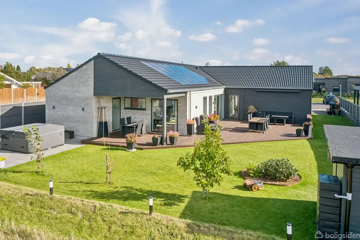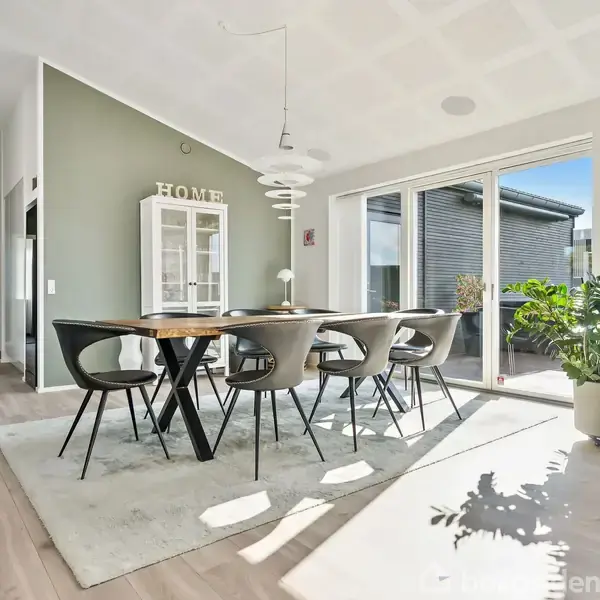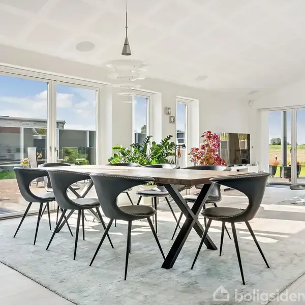 På Kornmarken 13 venter et hjem, hvor alt går op i en højere enhed – æstetik, funktion og komfort smelter sammen i en gennemført villa, opført i 2022 af kvalitetsbevidste Bernt Nielsen. Her bor du i naturskønne omgivelser, omgivet af åbne marker og ro, men samtidig tæt på hverdagens bekvemmeligheder. Fra det øjeblik du træder ind, mærker du stemningen af kvalitet. De lyse materialer, de rene linjer og den afbalancerede arkitektur giver en eksklusiv og rolig atmosfære. Det centrale køkken fra HTH er både elegant og indbydende – et sted hvor hverdagen samles omkring madlavning, samtale og nærvær. De store vinduespartier trækker lyset ind fra flere sider og lader naturen blive en integreret del af hjemmets indretning. Stuen ligger i åben forbindelse med køkkenet og byder på loft til kip, et imponerende lysindfald og indbyggede Sonos-højttalere, der fuldender oplevelsen af luksus og velvære. Herfra er der direkte adgang til den overdækkede terrasse – et perfekt sted at nyde solnedgangen over markerne med et glas vin, mens aftenen falder på. Boligen rummer tre gode værelser og to stilrene badeværelser – begge udført med inventar fra HTH. Masterafdelingen har eget badeværelse og ligger adskilt fra børne- eller gæsteafdelingen, hvilket skaber en naturlig fordeling mellem privatliv og fællesrum. Komforten er tænkt ind i hver eneste detalje. Hele huset har gulvvarme, og med både solceller, batteri, luft/vand-varmepumpe og BWT-blødgøringsanlæg er energiforbruget lavt og driften yderst økonomisk. Her er tale om et hjem, der ikke blot er smukt – men også teknisk intelligent og fremtidssikret. Udelivet er mindst lige så indbydende som boligen selv. Den velanlagte have er orienteret mod åbne vidder, og på terrassen kan du nyde stilheden, mens spaen inviterer til afslapning året rundt. Her leves livet i balance – omgivet af natur, men med alle moderne bekvemmeligheder lige ved hånden. Kornmarken er et nyere og harmonisk kvarter, hvor tryghed og fællesskab går hånd i hånd. Området ligger i cykelafstand til skole og daginstitutioner, og med kort vej til både Køge og motorvej har du nem adgang til resten af Sjælland. Kornmarken 13 er kort sagt et hjem for dig, der ønsker det bedste fra to verdener – den moderne luksus og den landlige ro. Et sted, hvor hverdagen får et strejf af noget særligt.