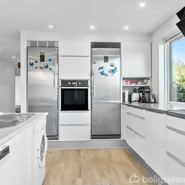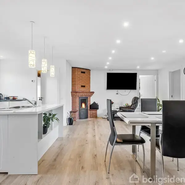 Åbent hus med tilmeldingskrav 2/2 - klik på billede - Indflytningsklar familievilla i eftertragtede Haslund I det populære og trygge Haslund finder I denne gennemrenoverede familievilla, hvor både planløsning, komfort og beliggenhed går op i en højere enhed. Her bor I i et levende lokalsamfund med kort afstand til natur, fritidsaktiviteter, skole, indkøb og motorvejen – perfekt til den aktive hverdag. Boligen fremstår særdeles velholdt og indflytningsklar. Siden 2021 er huset omfattende moderniseret med bl.a. gulvvarme, gipslofter med efterisolering, nye vinduer, nyt tag og nye døre, hvilket sikrer et moderne udtryk og et behageligt indeklima. Indretningen er gennemtænkt med en klar opdeling mellem børne- og forældreafdeling. Børneafdelingen byder på tre rummelige værelser samt eget badeværelse med dobbeltvask og bruseniche. Forældrene får en privat afdeling med stort soveværelse og stilfuldt badeværelse med både hjørnebadekar og bruseniche. Husets samlingspunkt er det lyse og åbne køkken/alrum, hvor store vinduespartier skaber et skønt lysindfald og en indbydende atmosfære. Stuen ligger i åben forbindelse og fuldendes af en hyggelig brændeovn. Herfra er der udgang til terrasse og have, som indbyder til både afslapning og samvær. Derudover findes et ekstra værelse, ideelt som kontor eller gæsteværelse, samt bryggers. Til ejendommen hører garage, udhus og et nyere isoleret udhus fra 2023 – oplagt til hobby, værksted eller ekstra opbevaring. Her får I kort sagt en moderne og velindrettet familievilla i et attraktivt område – klar til at danne rammen om jeres næste kapitel. Supplerende oplysninger: Tag: Nyt eternittag Ydermur: Gule sten Antenneforhold og internetforbindelse: Yousee og Norlys Kloakforhold: Ikke kloaksepareret / Vi henviser til ejendomsdatarapport Afstand til skole og daginstitution: ca. 3,5 km Afstand til indkøb: 3,5 km Overtagelse: Fleksibel