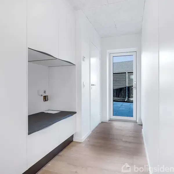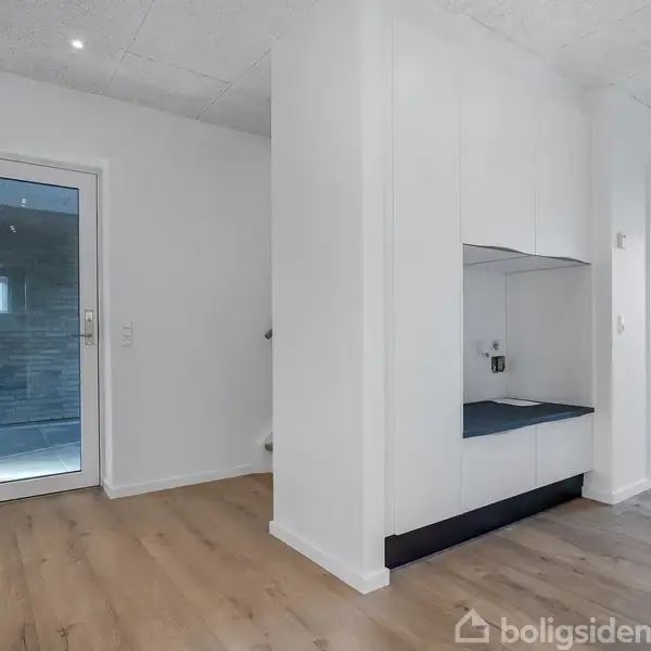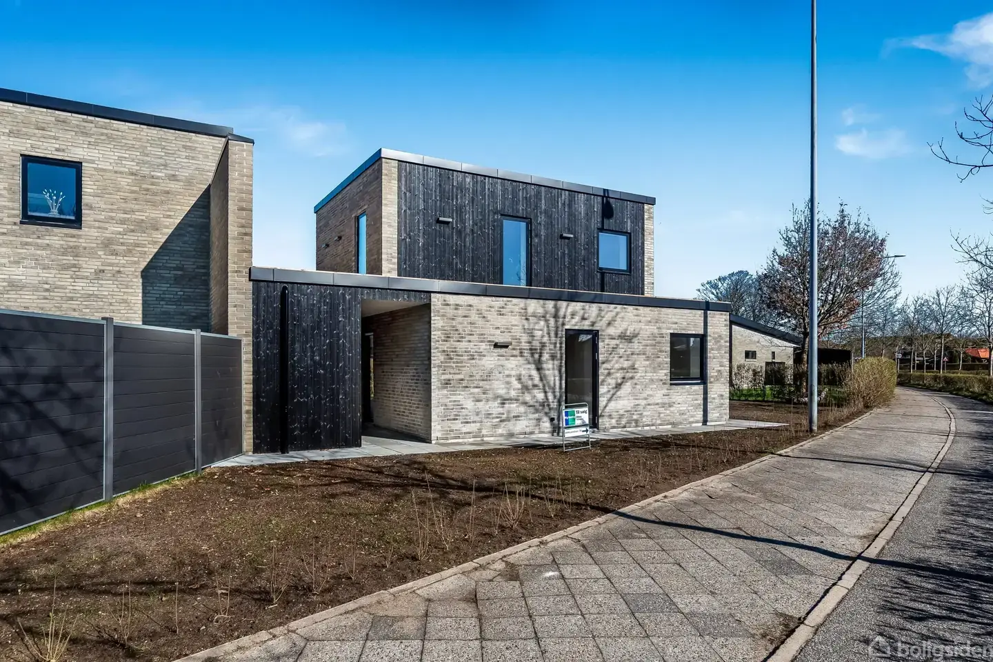 Dette flotte og aldrig beboede funkishus på 115 m2 som ligger på en rolig og bynær adresse kan nu blive jeres nye hjem. Udtrykket er overalt moderne og lækkert, og materialerne er afstemte og koordinerede. Samtidig er der nytænkt med udnyttelse plads og m2 på en spændende måde, mens et minimalt vedligehold er tilføjet og medindtænkt. Facaderne er murede i lyse mursten, vinduer og døre er i sort træ/alu lavenergi, der er tagpap på taget og den øvrige inddækning er enten sort vedligeholdelsesfrit