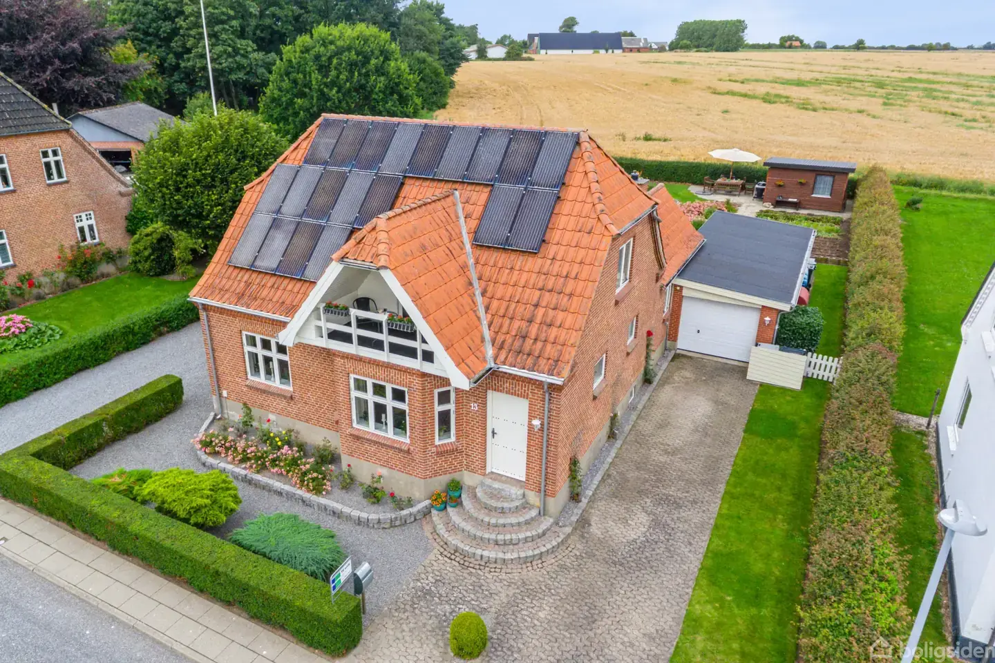 Charmerende murstensvilla med solceller, lys og unikke uderumVelkommen til en stemningsfuld og indflytningsklar murstensvilla fra 1935, der kombinerer klassisk charme med moderne komfort. Her får I en bolig med varme i både materialevalg og atmosfære – og samtidig en planløsning og energiløsninger, der passer til det moderne familieliv.Huset fremstår indbydende med karakterfulde facader, en smuk trappeopgang og store vinduespartier, der lader dagslyset strømme ind i boligens hjerte. Den flotte k