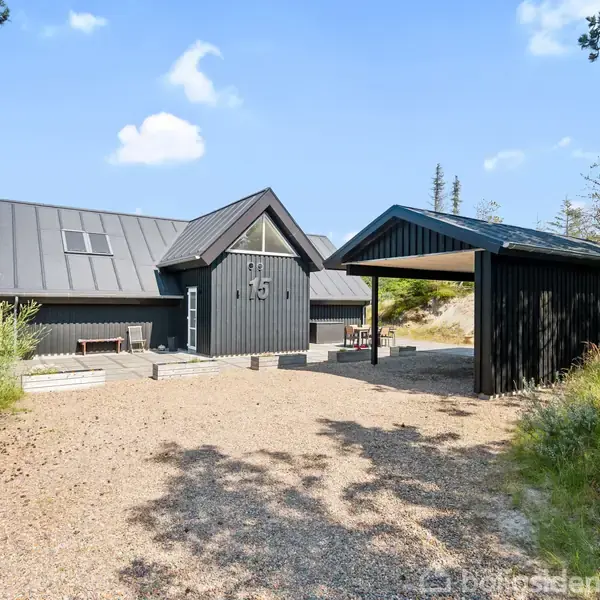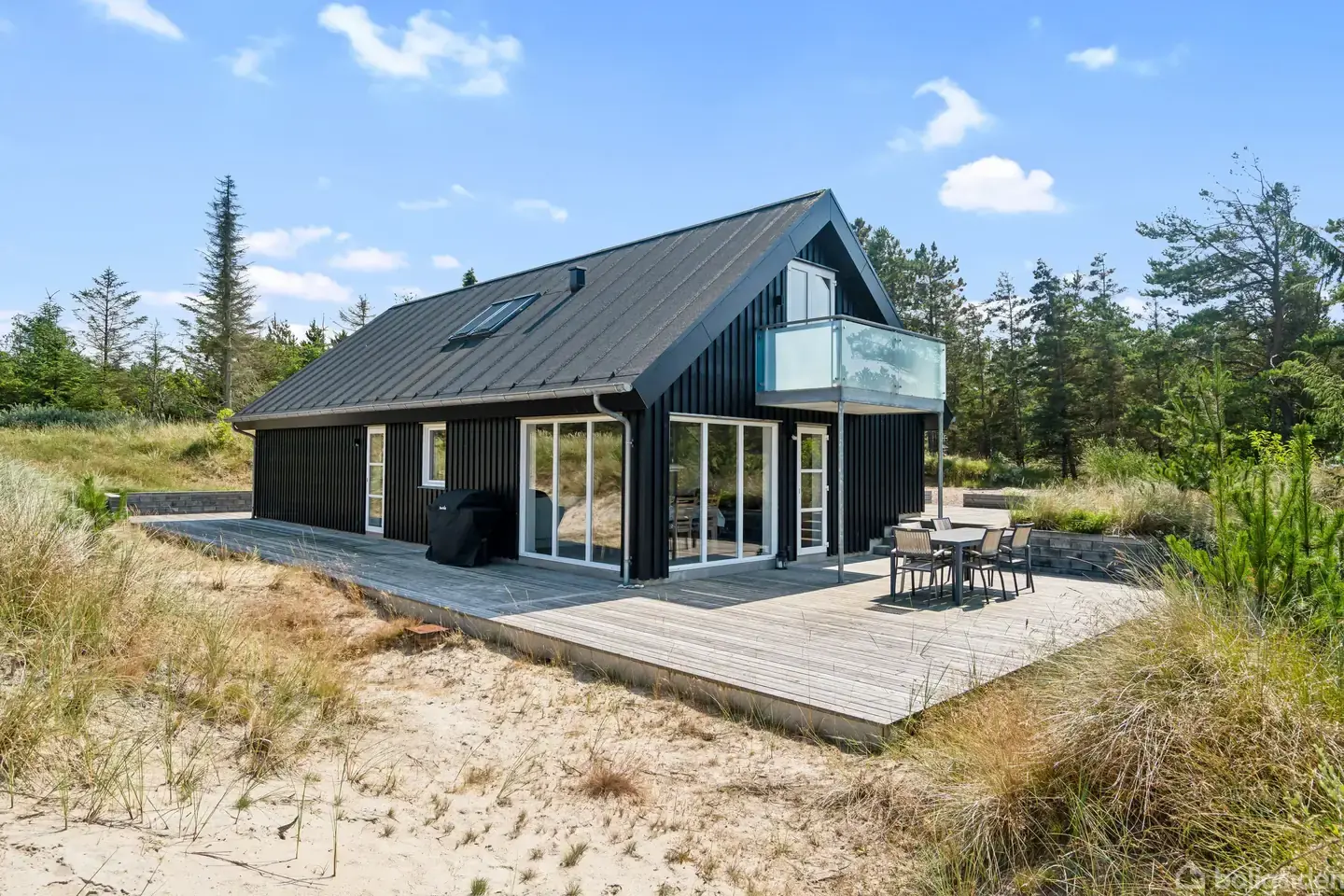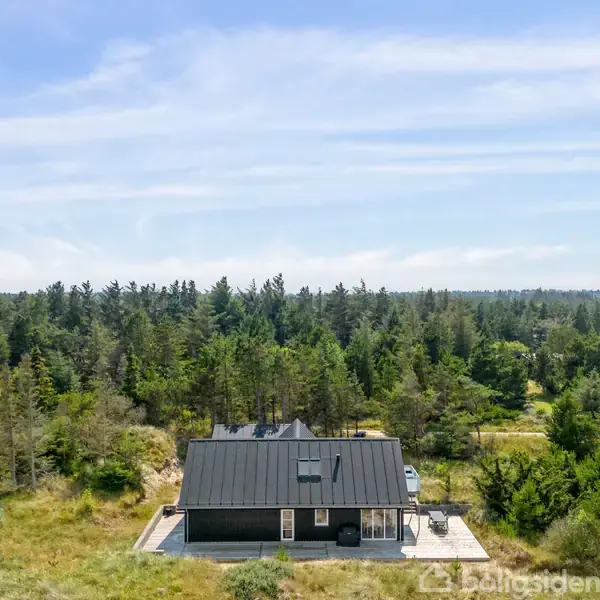 NYBYGGET SOMMERIDYL PÅ FANTASTISK NATURGRUNDLækkert, nybygget fritidshus Altan og terrasse under solens stråler Skøn naturgrund med fredet klitlandskab Rigt dyreliv – “som en zoologisk have” Med Vesterhavets brusen som lydtapet Nær blødt sand og blåt vand  Luk øjnene. Mærk, hvordan solen luner huden; duft til brisen, let krydret af lyng, gran og salt; og lyt til Vesterhavets brusen, som rumler beroligende i baggrunden. Åben så øjnene og se jer omkring. Lad blikket glide over smukke træer, hvidt