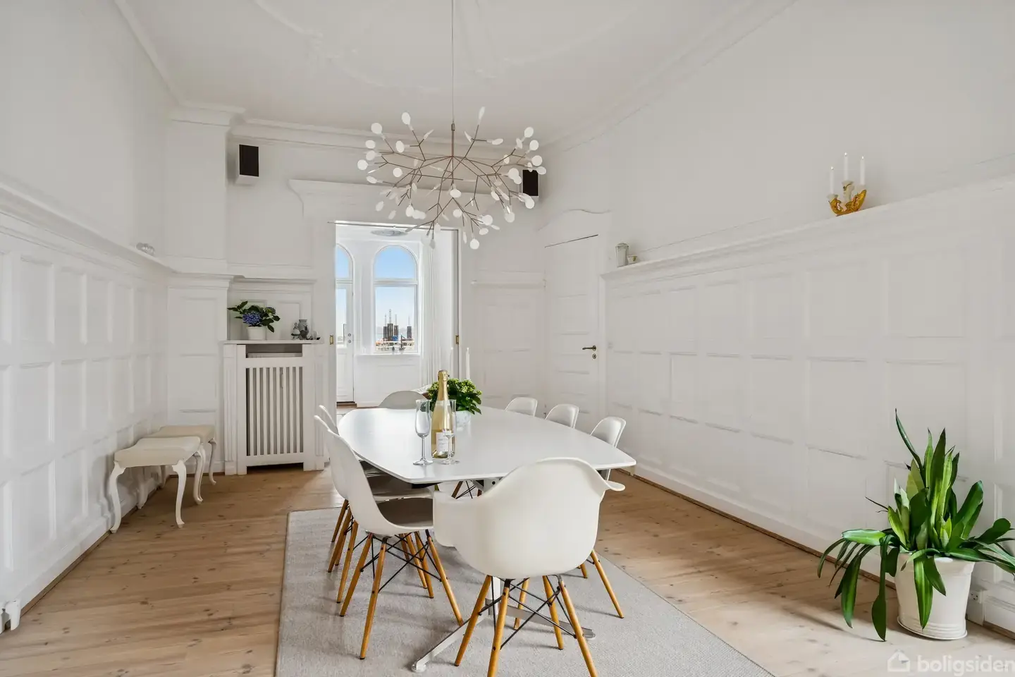 Når du bor med alle byens tilbud lige uden for din hoveddør, har du altid noget at give dig til. Sådan er tilværelsen her på Kystvejen 51, hvor du i denne store herskabslejlighed på anden sal finder fred og ro, selv om du er midt i byen og tæt på vandet.Lejlighedens cirka 180 lyse kvadratmeter er indrettet med tre smukke stuer en suite, en spisestue samt et soveværelse. Boligen har en helt særlig atmosfære, hvor klassisk elegance og moderne komfort går hånd i hånd. De originale detaljer som stuk