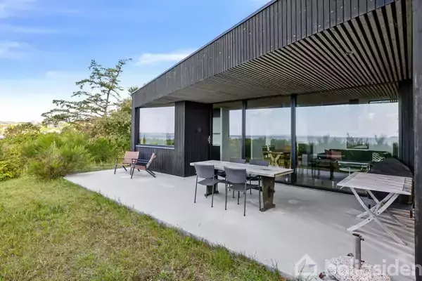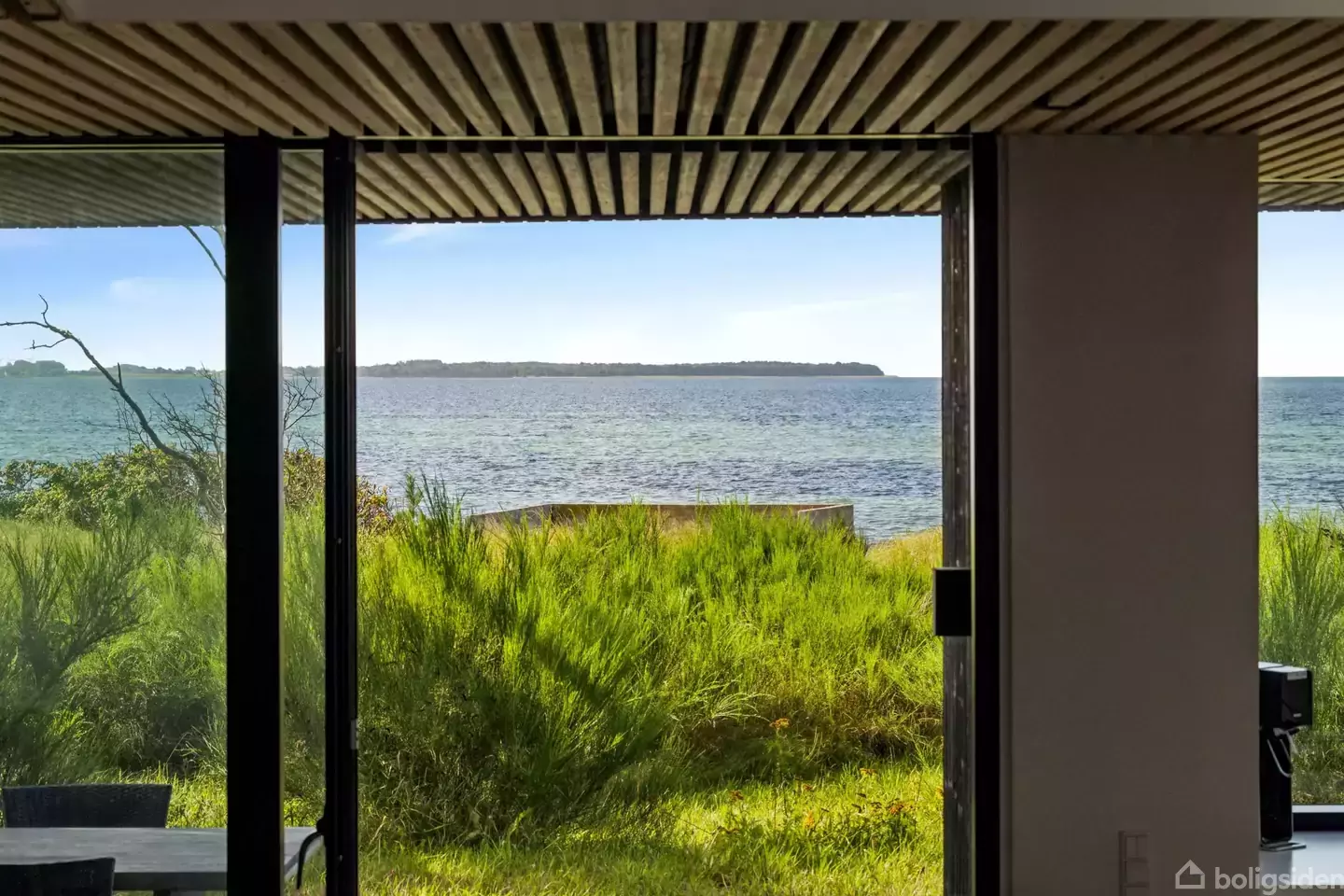 I første række på vigens kystlinje ligger der en ejendom, som har været i samme familie gennem tre generationer. Det er ligeledes det tredje sommerhus, der nu ligger på grunden, og det er et hus, som er udført med sans for komfort og kvalitet. Alt er kort sagt i orden, men alligevel er det nu omgivelserne, der løber med opmærksomheden. Udsigten over vandet er en af dem, hvor man må ty til at sige, den skal opleves - ord forslår knapt. Samtidig er hele Djursland et område fuld af noget af Danmark