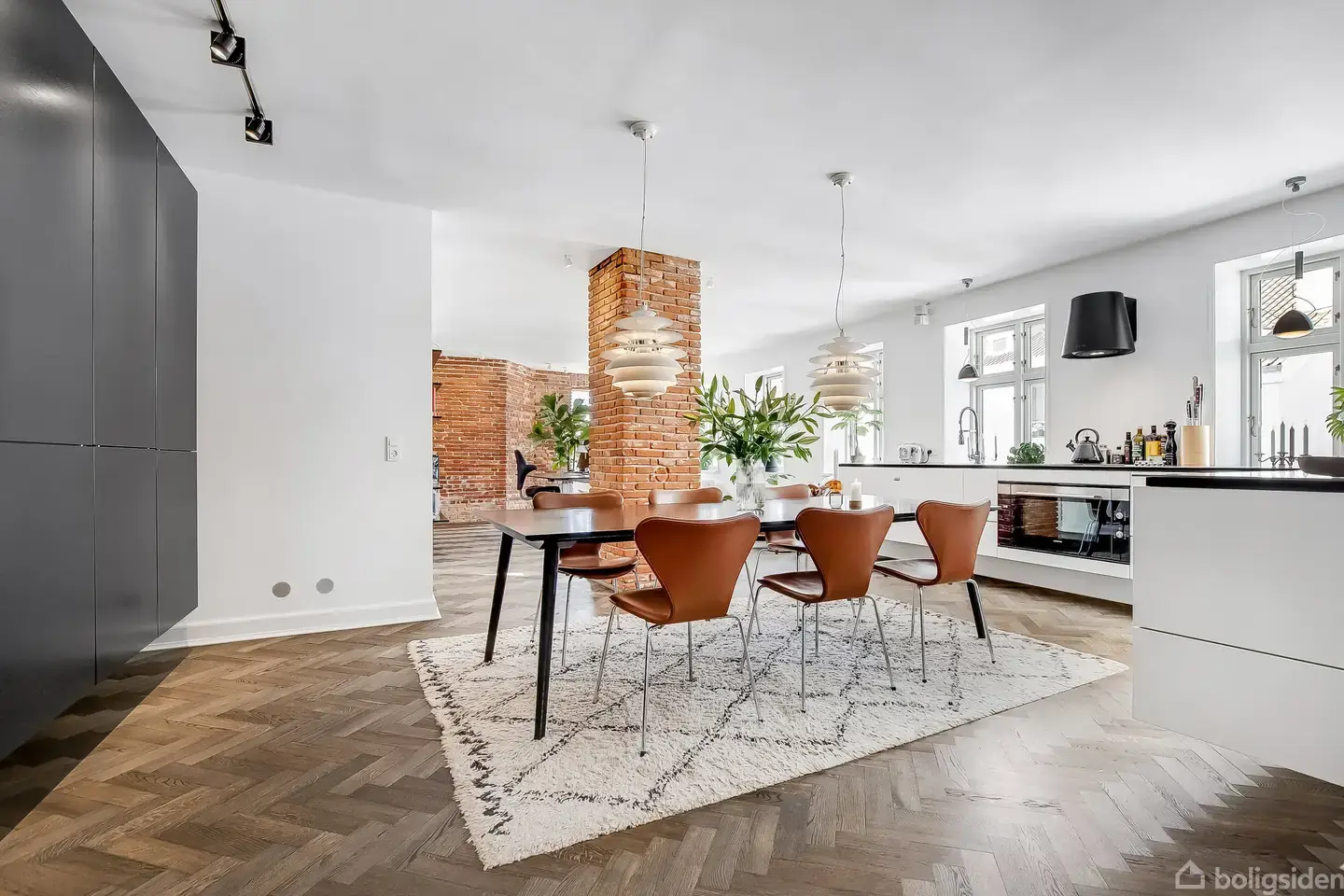 Indflytningsklar penthouse-lejlighed med solrig altan midt i KoldingPå Låsbygade 71A, 2., øverst oppe i en charmerende ejendom med blot tre lejligheder, udbydes nu denne indbydende og rummelige lejlighed på hele 149 kvadratmeter. Her får du masser af plads, moderne komfort og en attraktiv beliggenhed i hjertet af Kolding – tæt på alt det, byen har at byde på.I lejligheden finder du en masse smukke detaljer, som bl.a. blotlagt murstensvæg, massiv egeparket i sildebensmønster, og generelt en moder
