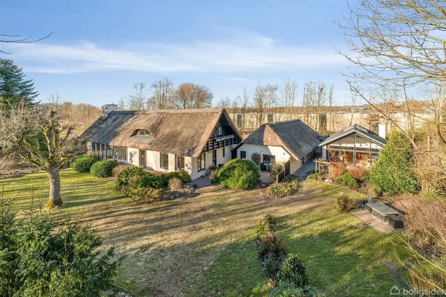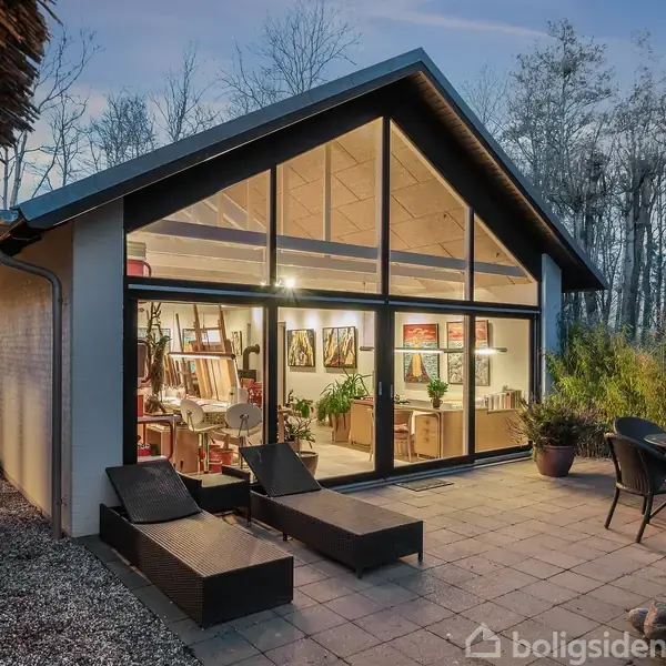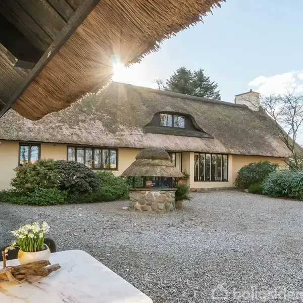 Åbent hus med tilmeldingskrav 1/2 - klik på billede - Den tidligere skolebygning, opført i 1883, blev efter lukningen ombygget i 1965 og er siden løbende opdateret med respekt for den oprindelige stil. Resultatet er en karakterfuld bolig, der fremstår både tidssvarende og autentisk. Beliggenheden fuldender oplevelsen med grønne omgivelser kombineret med bekvem afstand til byens tilbud. Ejendommen præsenterer sig med en smuk, gul facade, mørke vinduesrammer og et charmerende stråtag med kviste, som tydeligt signalerer kvalitet og sjæl. Under ombygningen har man haft fokus på at bevare husets varme udtryk, samtidig med at der er valgt materialer og løsninger, som matcher krav til komfort og funktionalitet. Det er arkitekt Einer Mielby har stået for transformationen, hvilket afspejles i den veludnyttede planløsning og de gennemtænkte rumforløb. Boligens naturlige samlingspunkt er den imponerende stue med en loftshøjde på over 5,3 meter. De synlige, ludbehandlede fyrretræsbjælker bidrager til den særlige atmosfære, mens pejsen, beklædt med håndlavet Altaskifer, skaber både varme og stemning. Gulvet er udført i Ølandsfliser med gulvvarme, og via få trin opnås en naturlig overgang til alrummet, som understøtter et åbent og sammenhængende opholdsareal. Materialevalget er konsekvent og gennemført med fokus på naturmaterialer. Køkkenet fremstår lyst og indbydende med marmorbordplader, udskårne detaljer og vitrineskabe, der understreger boligens klassiske udtryk. Der er i alt tre badeværelser, alle udført i samme høje kvalitet - to med bruseniche og det øverste med badekar. Stueplan rummer et værelse, mens førstesalen byder på yderligere to, heraf det ene med altan. Fra reposen på øverste etage er der et flot kig ned over stuen - et område, der oprindeligt fungerede som lærerbolig. De udvendige rammer er tilsvarende velholdte og gennemtænkte. Garagebygningen med bryggers harmonerer med hovedhuset, og i 2011 blev der opført et markant atelier med ekstraordinært fokus på lys og rum. Loftet er ført til kip med mere end fire meters højde, og store vinduespartier i både tag og gavl sikrer et enestående lysindfald. Fra gavlen er der direkte adgang til haven, hvilket skaber en flydende overgang mellem inde og ude. Atelieret rummer herudover en sjælden fleksibilitet og åbner for en bred vifte af anvendelsesmuligheder. Det kan eksempelvis indrettes til liberalt erhverv eller kreativ virksomhed, ligesom det egner sig særdeles godt som teenageafdeling eller gæsteafsnit, idet der er eget badeværelse. Der er desuden mulighed for at omdanne bygningen til en selvstændig lejlighed, hvilket gør ejendommen velegnet til flere generationer under samme tag, to familier eller alternativt til udlejning, eksempelvis i form af bed & breakfast. Denne alsidighed giver ejendommen et markant ekstra potentiale, som sjældent ses i tilsvarende ejendomme. Grunden udgør hele 5.103 m² og er indhegnet med dyrehegn. Her er der rig mulighed for udeliv med et omfattende stisystem på ca. 500 meter, der snor sig rundt på ejendommen. Beplantningen er varieret og frodig med blandt andet høje rhododendroner, mens åbne partier giver plads til naturen. Enkelte områder opleves næsten som skov, og samspillet med de omkringliggende marker resulterer i et rigt dyre- og fugleliv. Ejendommen er særdeles privat, idet den tætte beplantning effektivt afskærmer omgivelserne - især i sommerhalvåret. Samtidig er der nem adgang til nærliggende stisystemer, som fører videre til grønne områder med søer og skov. En sjældent udbudt ejendom, der henvender sig til køberen, som ønsker noget ud over det sædvanlige.
