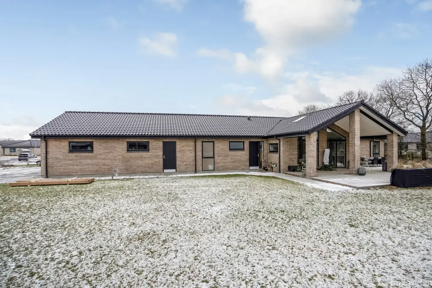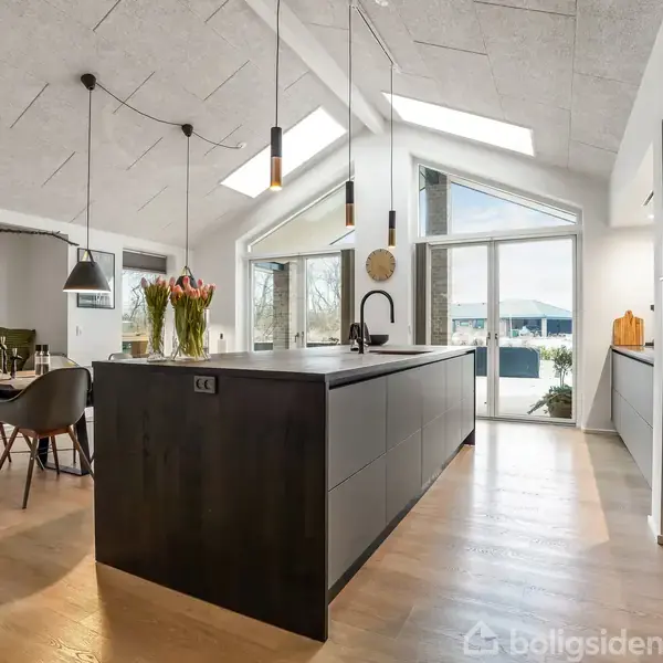 Velkommen til en moderne og gennemført étplansvilla, hvor der er tænkt over hver eneste detalje – fra arkitektur og materialevalg til planløsning og lysindfald. Her får du et hjem, der ikke bare er flot at se på, men som er skabt til at fungere i hverdagen og danne rammen om familieliv, samvær og ro.Allerede ved ankomsten mødes du af boligens rene linjer og tidløse udtryk. Den murede facade, det mørke tag og de velplacerede vinduespartier skaber en harmonisk helhed, der signalerer kvalitet og mo