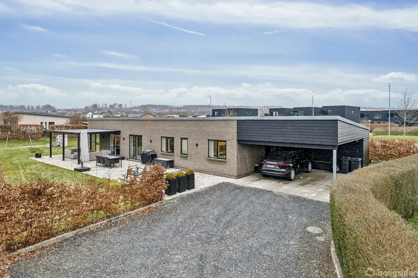 På Lærketoften 4 i Vejle kommer I til at bo i fredelige og familievenlige omgivelser – omgivet af store, spændende skovarealer blot få hundrede meter fra adressen og alligevel ikke meget mere end ti minutters cykeltur fra Vejles hyggelige centrum. Samtidig bliver I de heldige ejere af en flot nyere villa fra 2018, hvor der er god plads og tænkt på det meste. Der er tale om en flot, minimalistisk murstensejendom fra 2018 med overdækket terrassemiljø. De 160 boligkvadratmeter er velindrettede og b