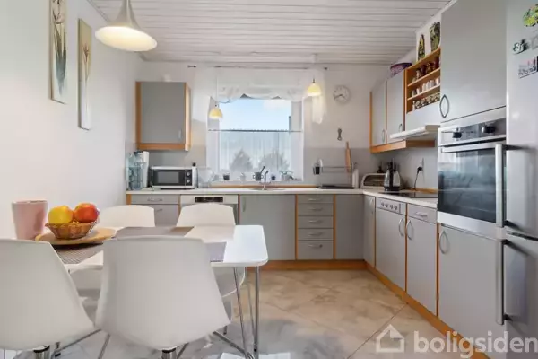 Fin, velholdt og overskueligt hus med dejlig have. Dette velholdte og regulære hus, opført i 1989, er ideelt til dem, der ønsker et hus af overskuelig størrelse til en god pris. Med 112 m², moderniseret i lyse nuancer, fremstår huset indbydende og helt indflytningsklar.Køkkenet, som er hyggeligt og funktionelt, har åben forbindelse til den store stue, der er fyldt med naturligt lys fra et stort vinduesparti. Fra stuen er der adgang til en flisebelagt terrasse, hvor man kan nyde roen og udsigten