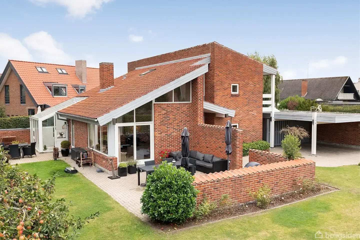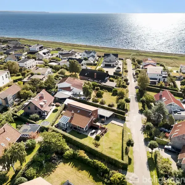 Åbent hus med tilmeldingskrav 1/2 - klik på billede - Søger I en villa, hvor bølgernes sagte brusen kan høres i haven, og hvor den daglige nærhed til havet giver mulighed for både skønne gåture langs kysten og en forfriskende morgendukkert? Denne villa har kun haft én ejer, som fik den opført i en spændende, entydig arkitektur med en meget høj kvalitet, der stadig kan mærkes den dag i dag. Villaen byder velkommen i en rummelig entré med højt til loftet og et smukt kig gennem huset. Den centrale spisestue ligger i direkte forbindelse til køkkenet, og drømmer I om køkken/alrum, kan det nemt etableres. Fra spisestuen er der direkte udgang til en skøn, sydvendt gårdhave. Ved køkkenet finder I et praktisk bryggers, som også fungerer som daglig indgang. Et par trin fører ned til en hyggelig pejsestue, hvor sælger har tilføjet en glas-karnap, der gør rummet lyst og inviterer haven indenfor. Derudover rummer villaen endnu en stue med loft til kip og et fantastisk lysindfald fra de store vinduer – det oplagte samlingspunkt for familie og gæster. Herfra er der udgang til en stor vestvendt terrasse og den grønne have. I stueplan findes desuden et praktisk gæstebadeværelse og et godt værelse med udgang til gårdhaven. På 1. salen finder I to store værelser, hvoraf det ene nemt kan føres tilbage til de to værelser, det oprindeligt var. Fra alle værelser er der havudsigt (sikret med servitut) og udgang til svalegang. Etagen rummer desuden et rummeligt badeværelse med brus samt et depotrum, som oprindeligt var tiltænkt som sauna. Grunden er stor og åben med flere hyggelige kroge, hvor man altid kan finde læ og nyde solen på de gode sommerdage. Til villaen hører også en carport med udhus samt praktisk redskabsrum. Vi glæder os til at vise jer denne skønne villa!