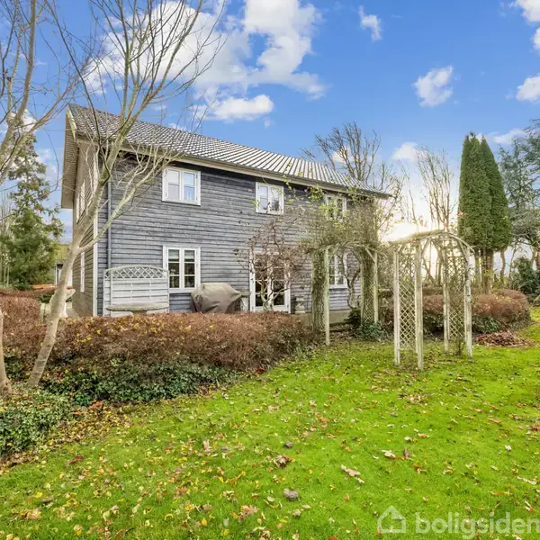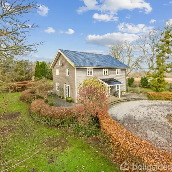 Fantastisk villa på landet med fine udbygninger, fantastisk parklignende have og plads til hobby og dyrehold. - Virkelig flot træhus, bygget i år 2001 i vejrbestandigt lærketræ. Stilen er unik og gennemført med en rød tråd der går igen i designet af både udhusbygninger, garage, udearealer, have mv. Virkelig gennemført. - Villaen er løbende moderniseret siden opførelsen og fremstår flot og moderne med respekt for den oprindelige stil. - Flot hvidt landkøkken fra 2020, der byder på rigtig god bord