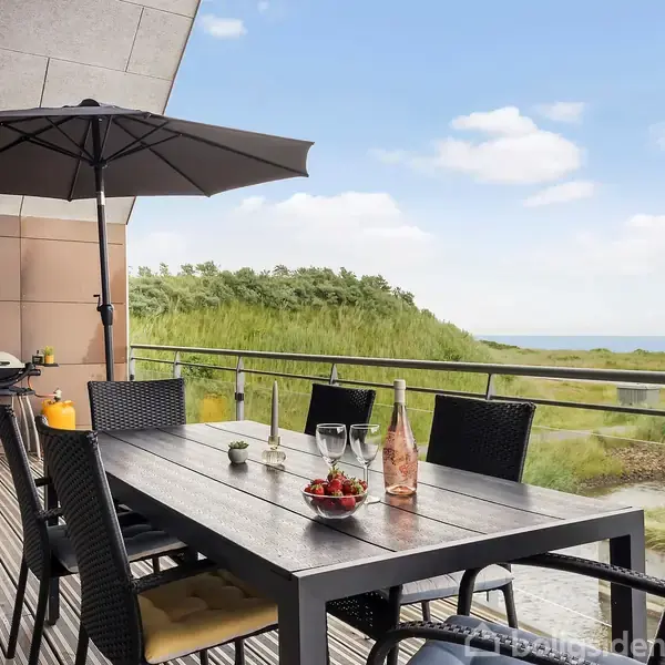 Åbent hus med tilmeldingskrav 9/2 - klik på billede - Her tilbydes en moderne og indbydende ferielejlighed med en helt særlig beliggenhed i hjertet af Hvide Sande. Fra adressen har du byliv, lystbådehavn og Ringkøbing Fjords smukke miljø lige uden for døren – naturens kraft på sindet er uundgåelig, og i Hvide Sande er naturen lige uden for døren. Derfor føles det som balsam for sjælen at komme til Langsand 116 og bare mærke roen falde over én. Lejligheden på 1. sal med højt til loftet og store vinduespartier sikrer en helt unik udsigt til fjorden, og trækker i samme moment naturen helt ind i stuen. Lejligheden byder på et lyst og åbent opholdsrum, hvor køkken, spiseplads og stue er forenet i ét. Hertil kommer et soveværelse med direkte adgang til stue og terrasse, to gode værelser med skabsplads samt to moderne badeværelser med væghængt toilet og bruseniche – det ene med integreret vaskesøjle. Hele boligen er udstyret med gulvvarme og mekanisk ventilation med varmegenvinding, som sikrer et behageligt indeklima året rundt. Fra den sydvendte terrasse kan du nyde en enestående udsigt over Ringkøbing Fjord. Lige nedenfor løber en af områdets små kanaler, hvor der er mulighed for at sætte kano, kajak eller SUP-board i vandet og opleve fjorden helt tæt på. Ejendommen er en del af den attraktive ejerforening Langsand Langs Vand, der er kendetegnet ved moderne arkitektur, et lavt vedligeholdelsesniveau og et maritimt miljø med hyggelige kanaler. Til lejligheden hører egen parkeringsplads og depotrum. Udlejning sker via Feriepartner, hvilket giver mulighed for både egen feriebrug og nem udlejning. En skøn ferielejlighed med komfort, udsigt og beliggenhed i absolut særklasse – lige midt i Hvide Sande by !