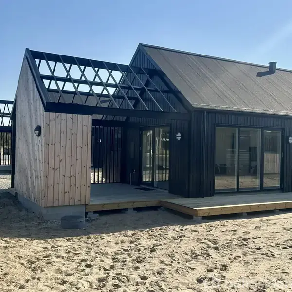 Skøn og særdeles velindrettet og moderne nyopført ferielejlighed i hjertet af Hvide Sande direkte ved Ringkøbing Fjord, havnemiljøet og lystbådehavnen. Feriehusene er omkranset af et typisk vestkystlandskab med klitter, marehalm, sandstrand og Vesterhavet indenfor få minutters gang herfra, hvilket understreger områdets unikke placering og dets rolighed midt i byen i et nærområde med små kanaler og en helt speciel maritim stemning! Naturligvis kombineret med en beliggenhed meget tæt ved fjorden. Indretning: Ferielejligheden opføres i 1 plan. Entre med indgang fra den nordvest vendte terrasse, multirum på 30 kvm., indeholdende køkken i åben forbindelse med spise- og opholdsstue, hvorfra der er adgang til den sydvest vendte terrasse. 2 soveværelser på 8,4 kvm. samt et mindre værelse på 6 kvm. Badeværelse samt gæstetoilet. Herudover består lejligheden som før nævnt af et terrasseareal på ikke mindre end 57 kvm. med mulighed for at etablere udespa/sauna. Der er gulvvarme i hele lejligheden. Til lejligheden hører egen P-plads. samt depotrum på 2,5 kvm, placeret i forbindelse med nord-vest-terrassen. Byggeriet afleveres som råhus:Som et alternativ til en fuld færdig feriebolig, kan der leveres et råhus hvor køber selv foranlediger at boligen færdiggøres indvendigt og færdigmeldes med tilhørende BBR m.m. Udvendigt leveres råhuset færdiggjort så det ved overtagelsen fremtræder ensartet i forhold til de allerede eksisterende boliger. Ved et råhus er følgende medregnet:-- Udvendig klimaskærm udført i træelementer med facader af trykimprægneret fyrretræ overfladebehandlet i sort farve og med ubehandlede felter (patinering via luft). Råhuset leveres udvendigt færdiggjort med malearbejde, tagpap i farve matchende bygning, tagrender/nedløb, vinduer og udvendige døre, målerkasse m. tilslutning samt træterrasse/lævæg i ubehandlet trykimprægneret træ. Endvidere lægges der græsarmeringssten ved p-plads og monteres pullert med lys ved vej. Indvendigt terrændæk inkl. gulvvarme og styring hertil samt tavle til el. Indvendige vægge og skillevægge udført i ubearbejdede fermacell plader. Der indlægges fiber til internet afsluttet ved box ved fordør. Ved et råhus er følgende IKKE medregnet: - Indvendig spartling og malerarbejde, indvendige døre samt fodlister /gerigter, klinker/fliser samt gulv, levering/montering af al inventar og hvidevarer, lofter, nedstropninger over værelser/entre/badeværelse samt krydsforskalling i køkken/stue, dampspærre i badeværelse, levering og montering af VVSsanitet, levering og montage af alle kabler,kontakter,spot og lampeudtag, herunder også for udvendig lys på huset, ventilation vedr. badeværelse/emhætte (kabelføring, rør, gennembrydning af ydervæg), samt tilslutninger for fibernet i teknikrum og router.