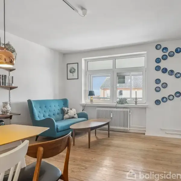 I denne indbydende lejlighed på 70 kvadratmeter får du en lys og rummelig atmosfære. Den charmerende stue er et perfekt samlingspunkt med store vinduer, der lader sollyset strømme ind og skaber en varm stemning. Her kan du indrette en hyggelig sofa- og spiseplads til lange middage og afslapning. Køkkenet er praktisk indrettet med hvide skabe og en smuk træbordplade, ideelt til madlavning og sociale stunder med direkte adgang til stuen. Lejligheden har to komfortable soveværelser, hvor du kan nyd