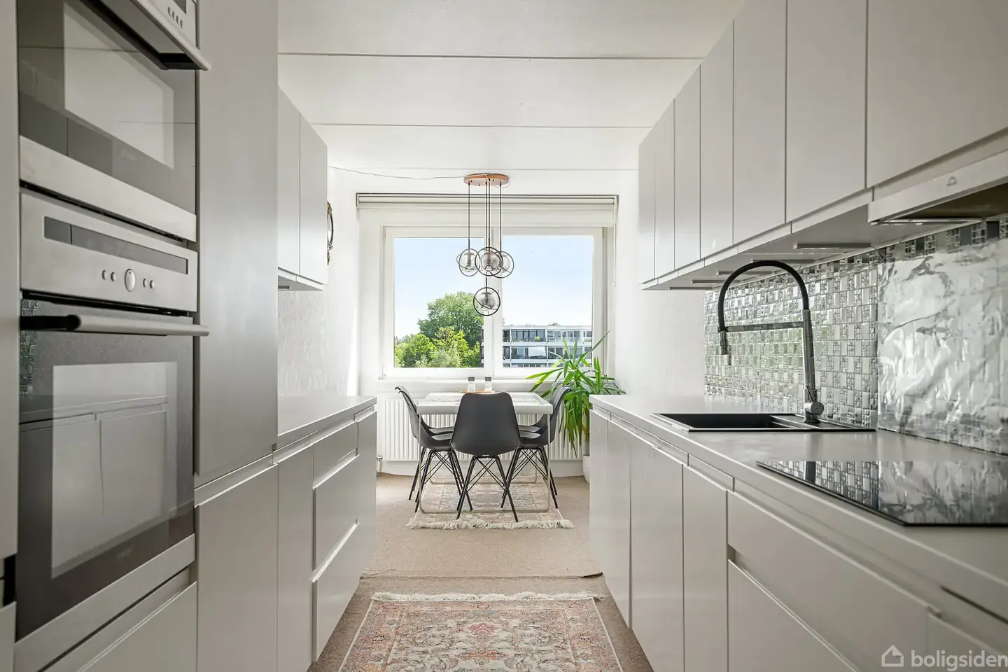 De forskudte facader og de grønne fællesarealer er med til at give Leen i Taastrup sit spændende arkitektoniske udtryk. Her har vi at gøre med en lys fireværelses lejlighed på anden sal, hvor dagslyset strømmer ind fra øst og vest og indretningen er perfekt for familien med op til to børn. Omme bag hoveddøren venter boligen med de veldisponerede kvadratmeter og den moderne indretning, hvor lyse overflader går igen i alle rum. Først mødes man af en god fordelingsentré, der på højre side giver ad
