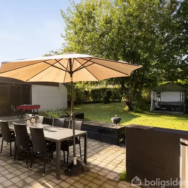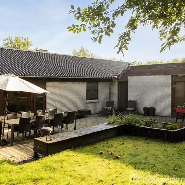 Enplansvilla 240 m² på 1.347 m² grund med pool og sauna. Villaen på 240 m² ligger på en stor grund på 1.347 m² og giver et tydeligt førstehåndsindtryk af rummelighed og udendørsliv. Den lave, etplansopbygning fra 1973 med lyse mursten og store, træindfattede vinduer fremstår samlet og indbydende, og carport samt bred indkørsel gør hverdagen praktisk fra første dag. Fra entréen mærker man straks boligens flow videre ud mod have og terrasse. Indretningen er gennemtænkt til familieliv med én stor o